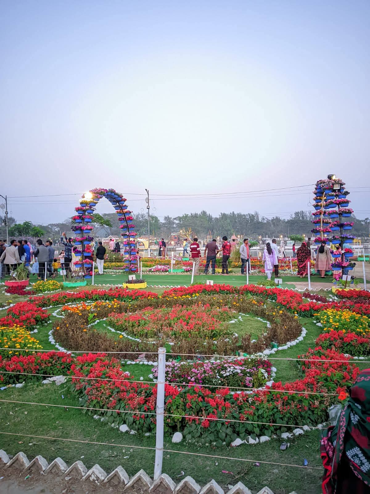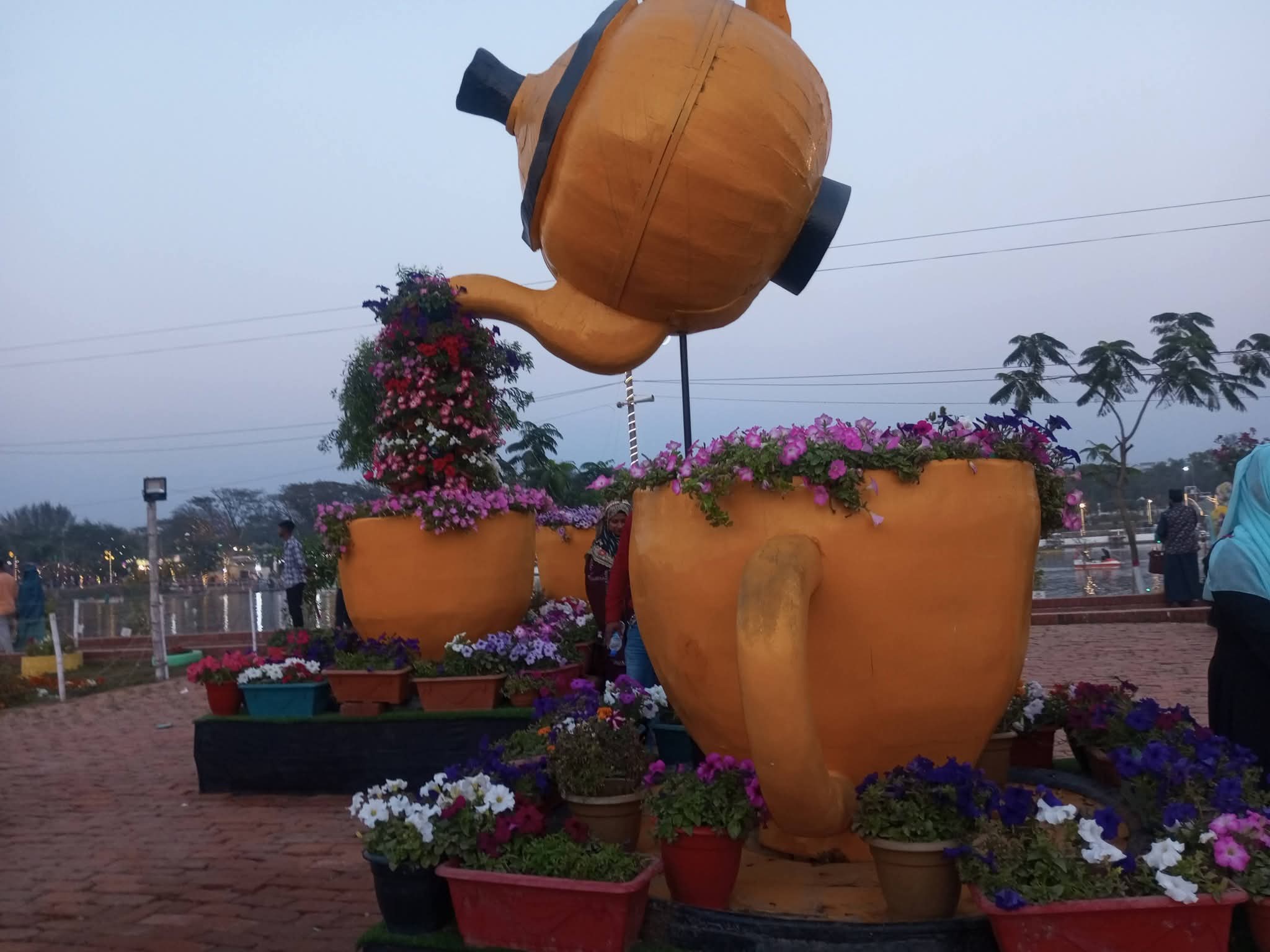 Afternoon heading to Chittagong for a Change of Heart Being emotionally overwhelmed, I decided to head towards Chittagong to clear my mind. While sitting in the car, I stared out the window at the passing greenery, reflecting on how fragile life truly is.Upon reaching Chittagong, I visited a beautiful park. The sight of blooming flowers and the creative landscaping immediately brought some calmness to my soul. The giant teapot and teacup-shaped flower displays were particularly stunning and unique.