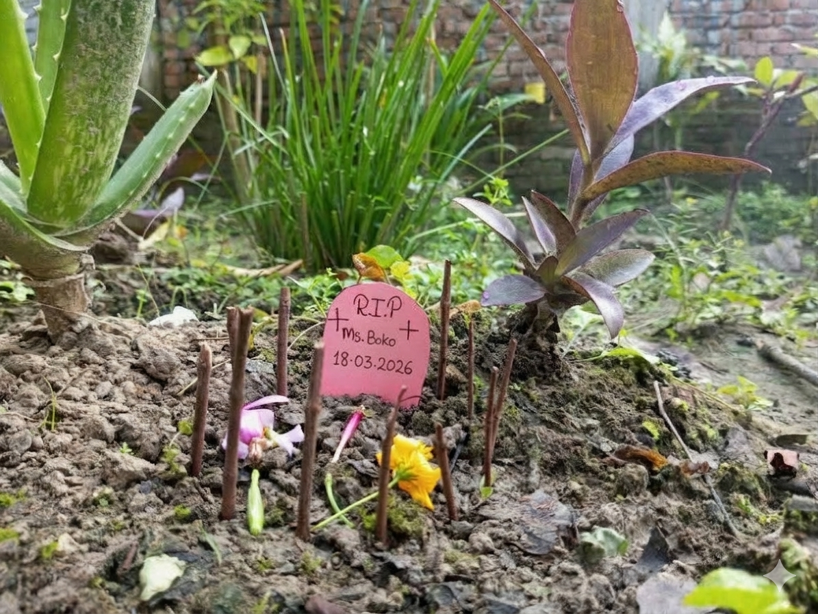 The sun didn't bring much joy to me this morning. As I woke up, I was met with a heartbreaking sight. My beloved little rabbit, whom I adored so much, has left us forever. Seeing its lifeless body made it impossible to hold back my tears the grave I buried my little friend in a quiet corner of our garden. I placed a small memorial marker over the grave. Losing a pet feels like losing a piece of your heart. May my little companion rest in peace.
