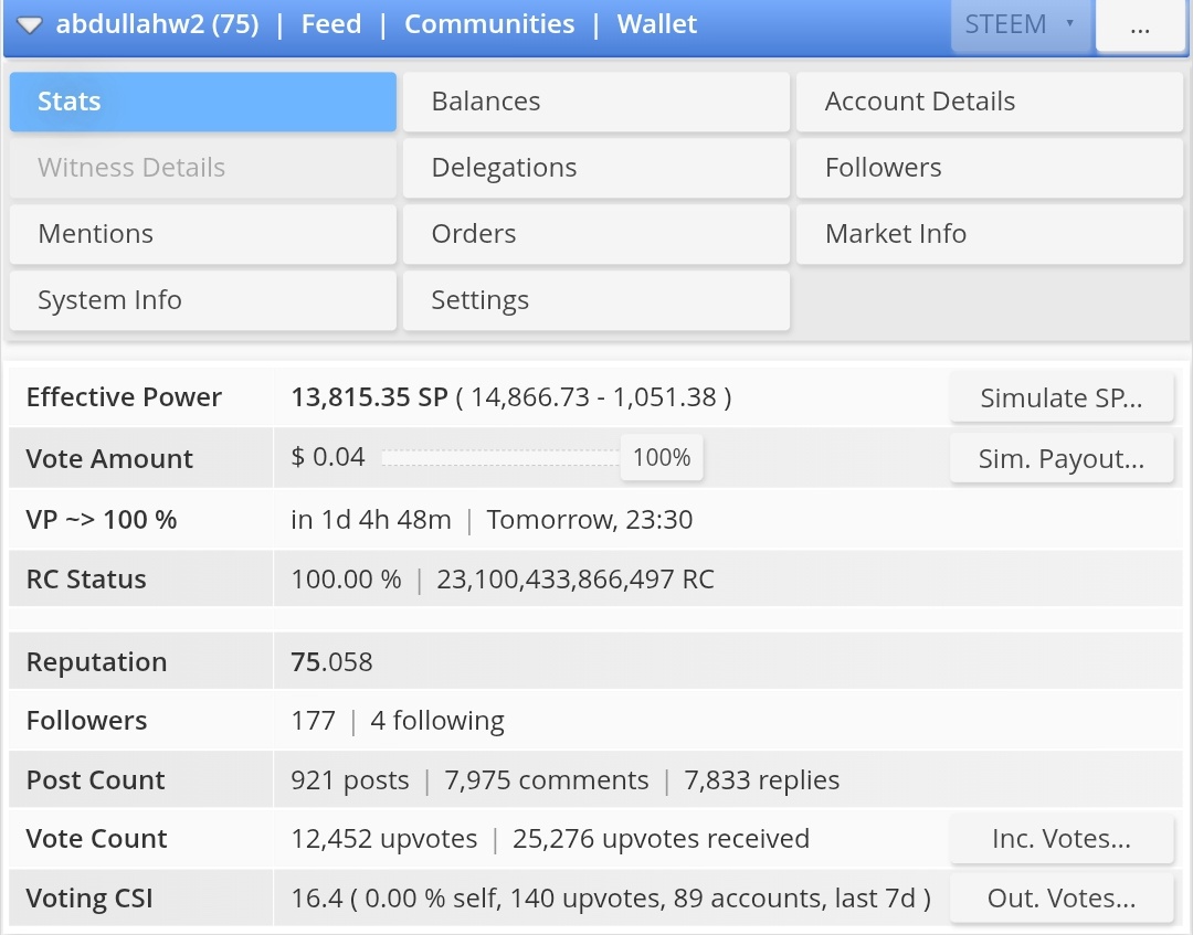 The key stats of my account (own SP, CSI, Reputation, Delegations)
