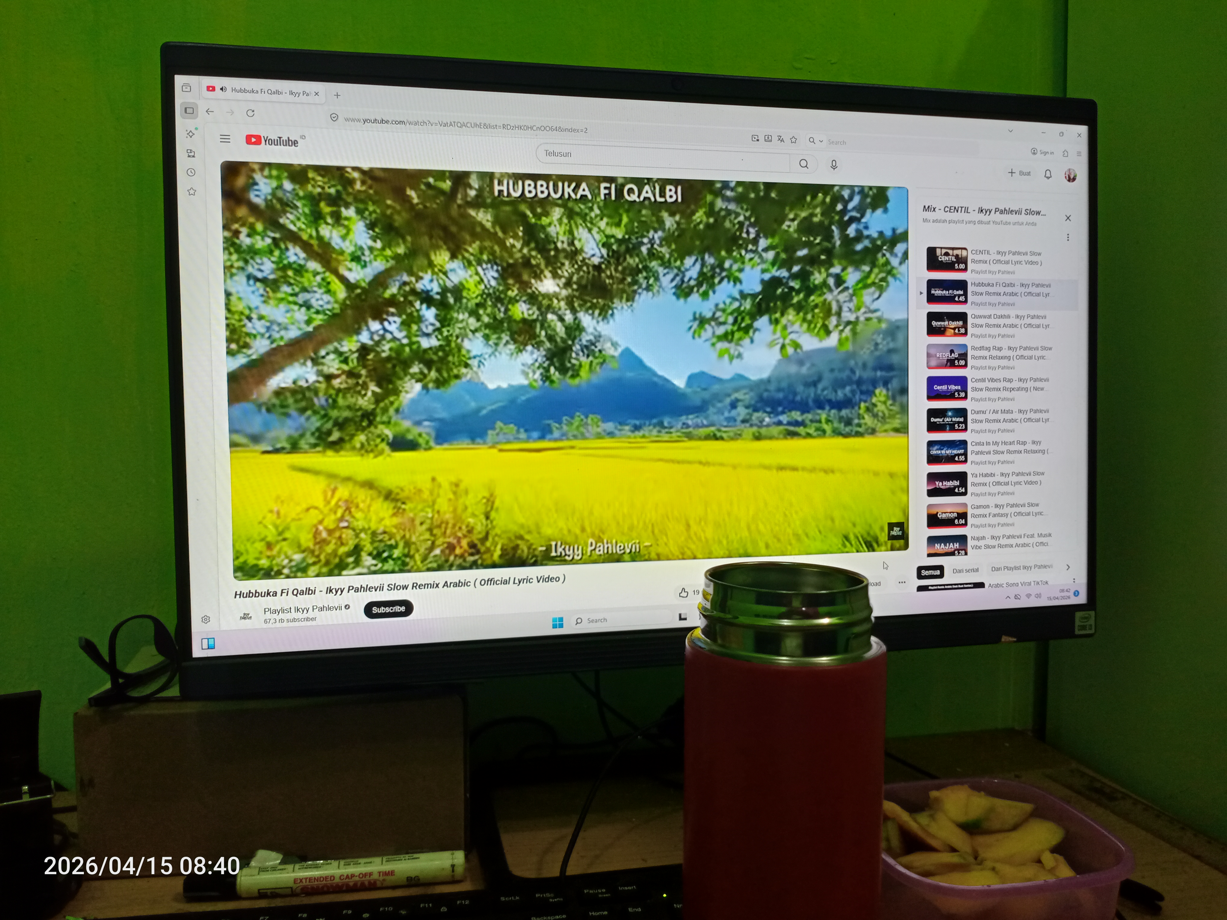 Aku membawa sejumlah bekal saat berangkat dari rumah tadi, berupa kopi espresso panas tanpa gula yang aku tempatkan dalam tumbler dan juga sedikit buah mangga untuk cemilan ku di hari ini.
