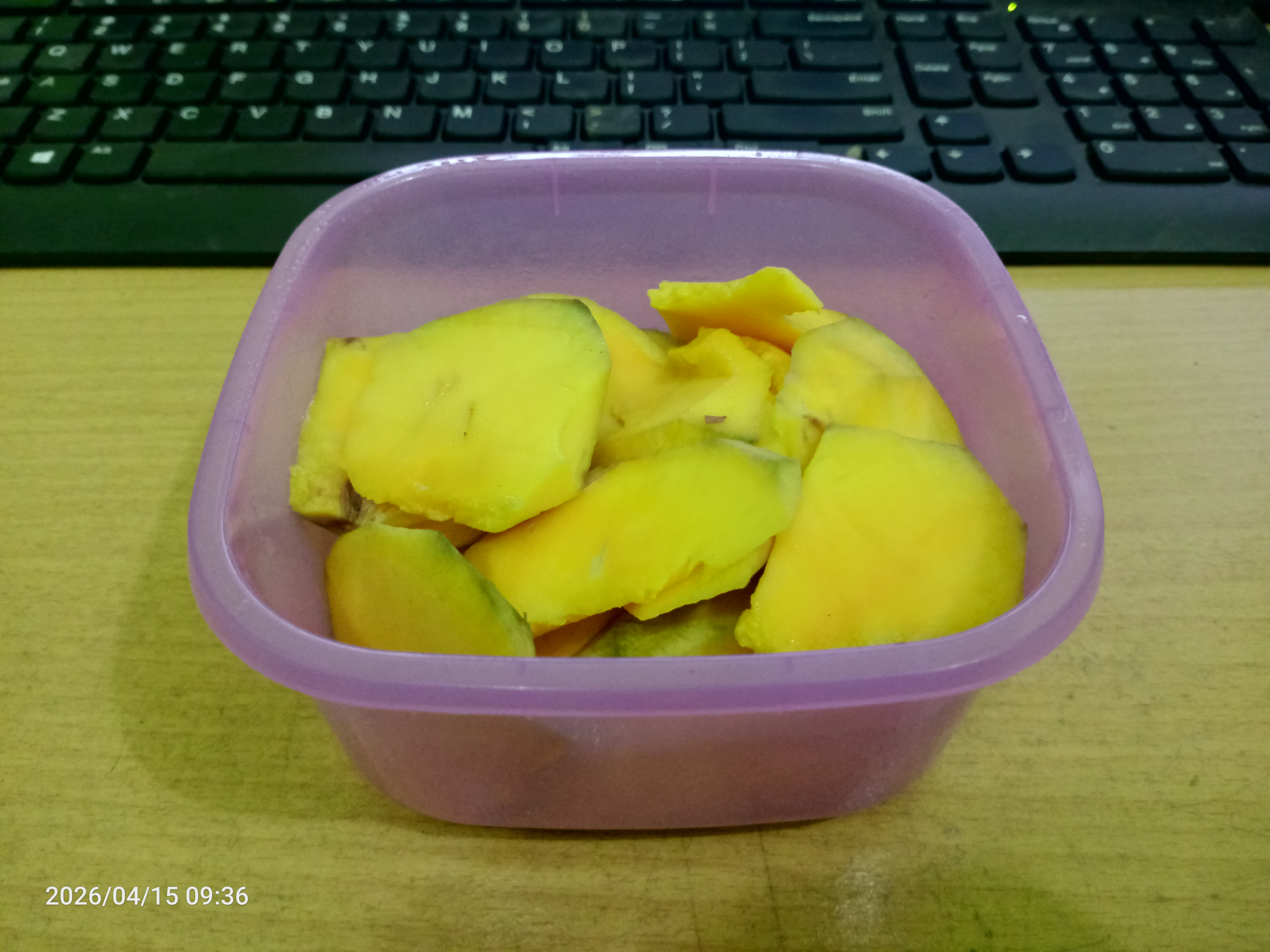 Buah manggaPotongan buah mangga yang aku bawa tadi pagi menemani aktivitas ku di kantor sampai menjelang tengah hari, yang merupakan buah mangga yang berasal dari pohon mangga yang aku tanam sendiri beberapa tahun yang lalu.