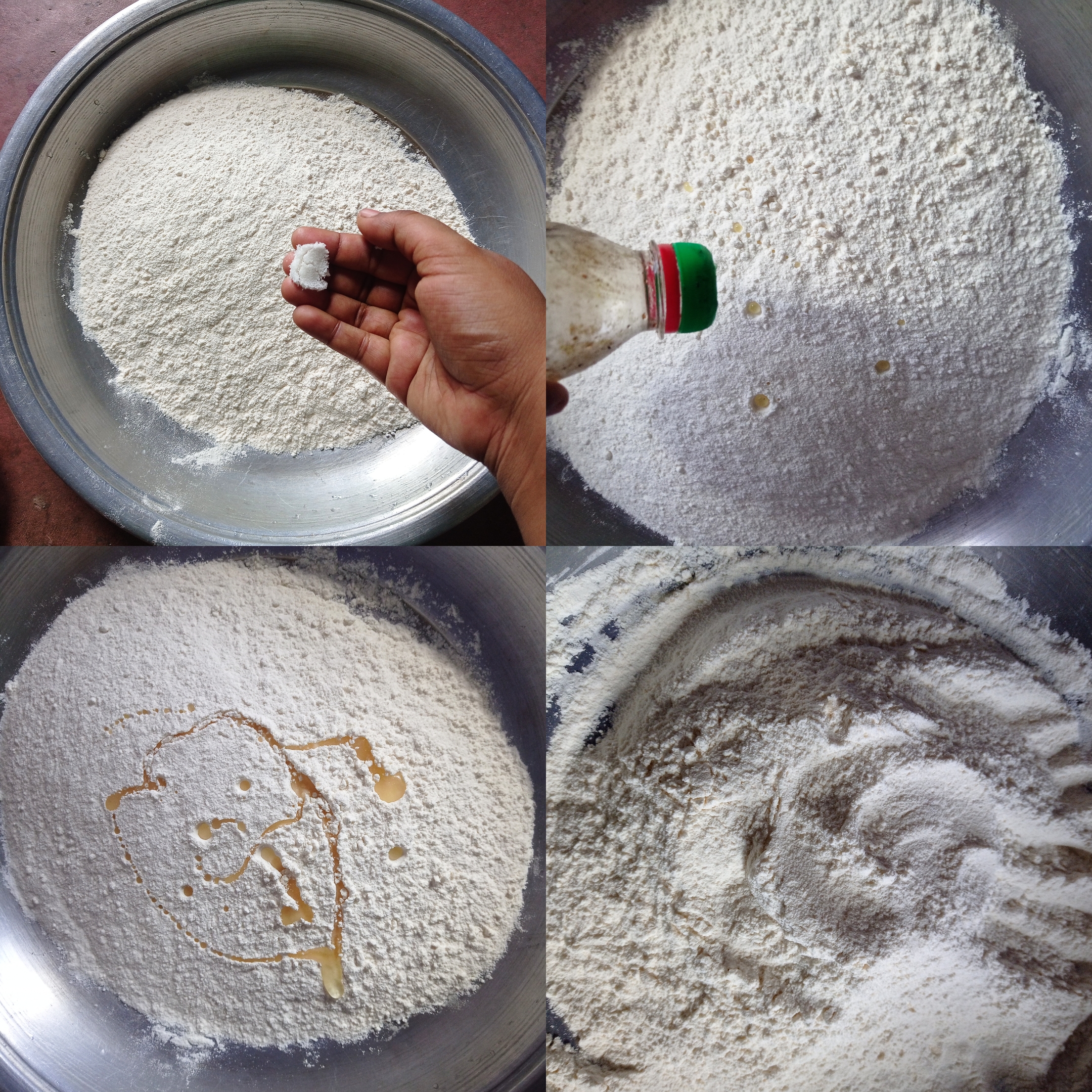 First, I mixed the flour with salt to taste and a small amount of oil, measuring two tablespoons, and kneaded the dough well with my hands.