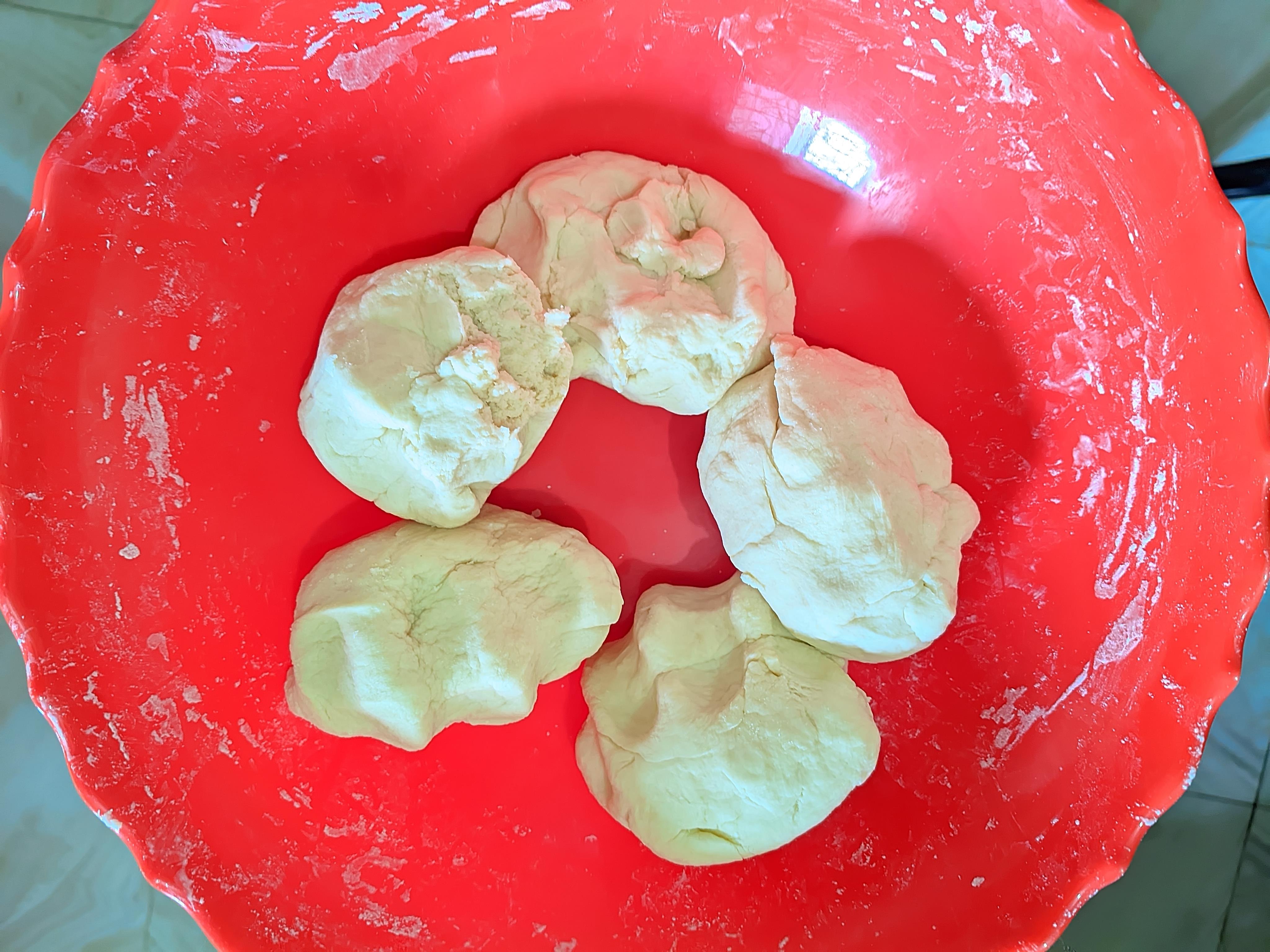 - Now I divide the mixed flour into 5 parts to make bread.