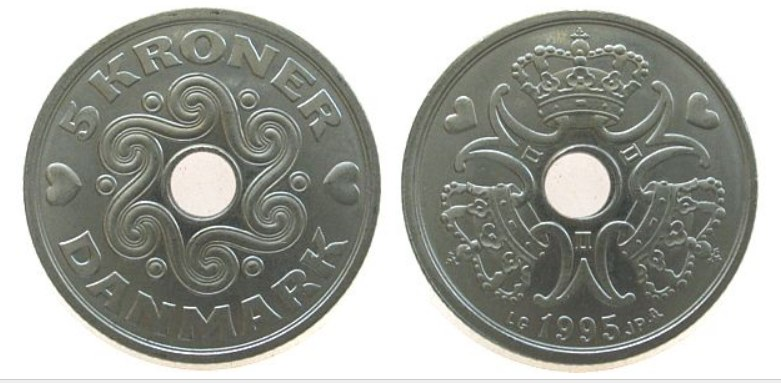 Es gibt einmal die Version mit der Wertseite nach außen, dann ist der Schriftzug 5 Kroner - Danmark zu erkennen - oder eine Version mit der Wertseite nach innen, dann erkennt man auf dem Relief die Kronen und Herzen.