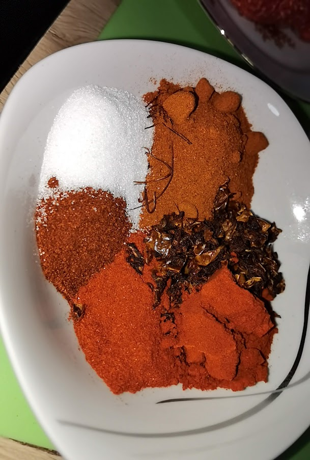 Rinderhack krümelig braten - dann Zwiebeln anbraten und dann dazugeben und mit anschwitzen - Knoblauch, Tomatenmark, Paprikapulver Edelsüß, Paprikapulver scharf geräuchert, Paprika und Tomatenflocken, Chili Fäden, Tabasco, Salz. Pfeffer, Zucker