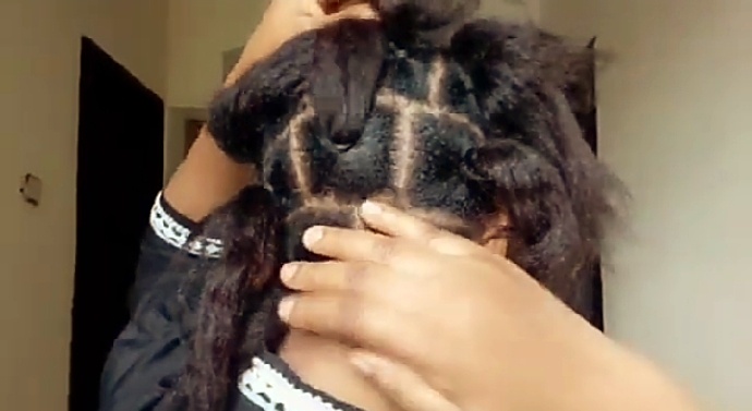 Next is to part the hair and keep them in sections, the parts need to be pretty large, just as the name implies Jumbo Twist. Here, we will have 20 sections or parts. To achieve even parts that look professional, you have to divide your hair into two big sections using the ear as a line mark. What do I mean? Section your hair from one side of the ear to the other side of the ear with a straight line. Now, you have two big sections, then keep the front section away, and work with the back first.