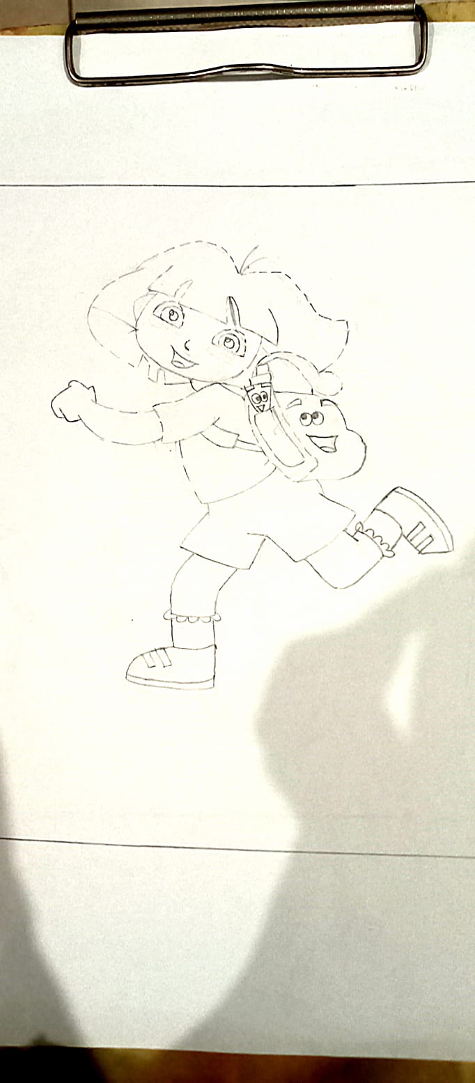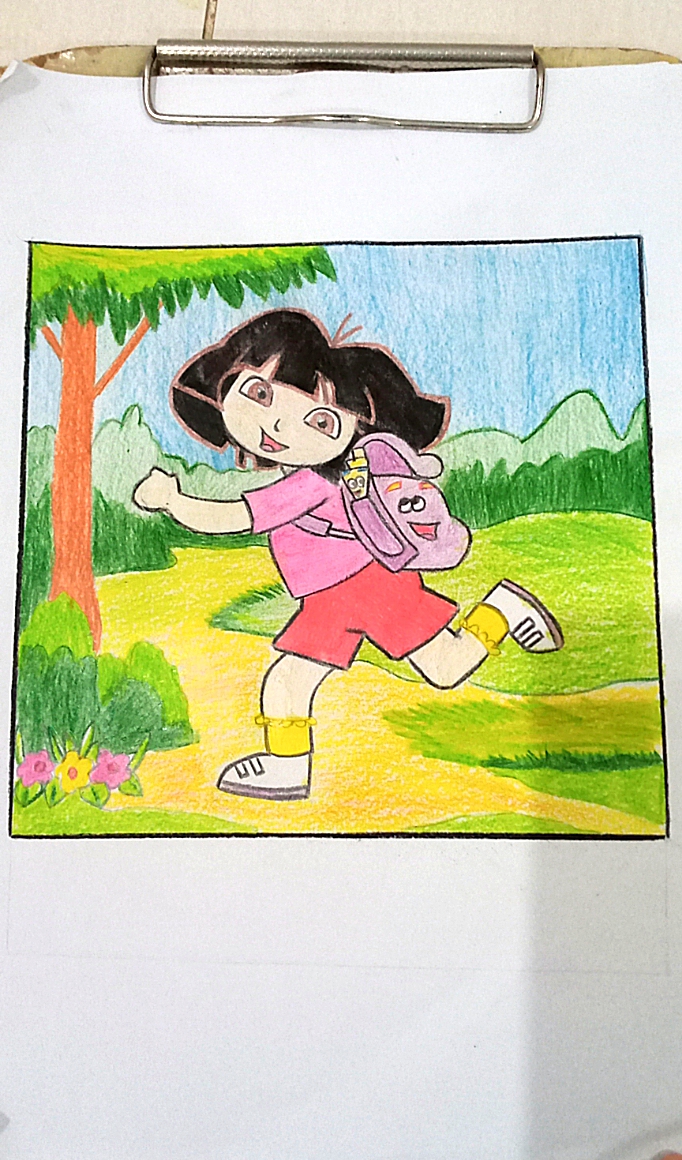 After this you have to colour it by your own way. So I want to make cartoon character Dora which is my favorite one 😋😋. I want to draw it in the center of my page so I leave 3 cm space from each side of my page.I start it with dotted lines .Now after completing my drawing .I used to colour it to make my drawing more beautiful .As you can see , by coloring my drawing look so beautiful.😍😍