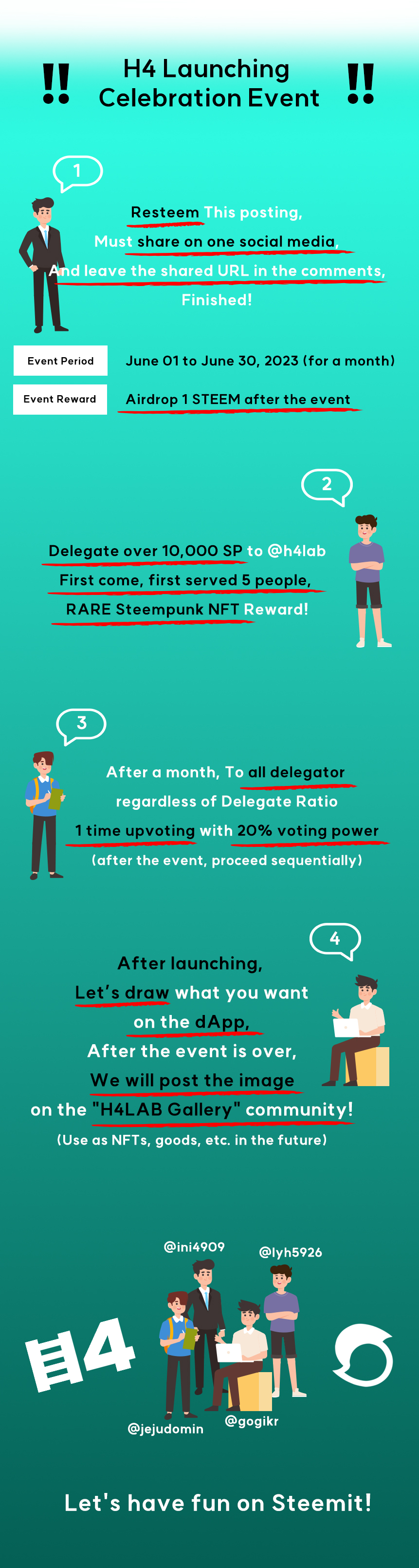 [D-DAY] H4LAB LAUNCHING !!h4lab (78)in Steem Japan • 3 years ago D-DAY, H4LAB LAUNCHING !! Written by @h4lab [What is H4 ?] [How to delegate to H4LAB ?] #1. Go to Our Homepage, using delegate menu : https://h4lab.com/delegate #2. Just Click this link : 100 SP / 500 SP / 1,000 SP / 5,000 SP [H4LAB Contact] #h4lab #announcement #kr