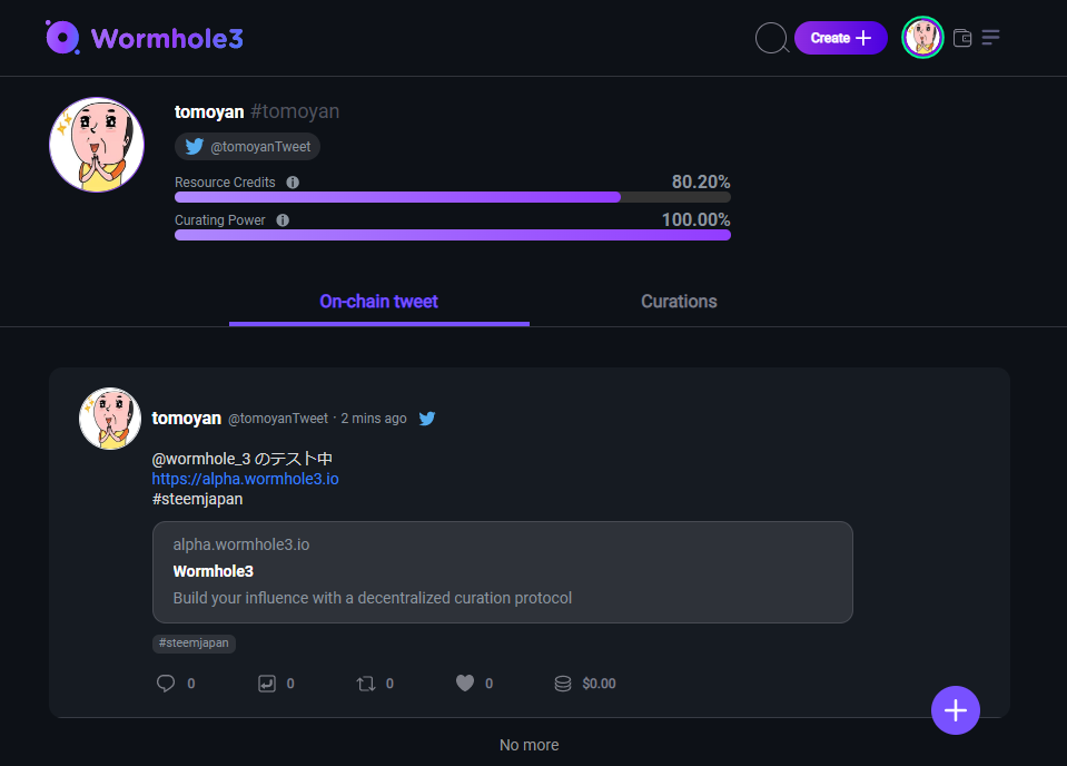 wormhole3をツイッターのように使う事もできるようなので、ここからCreateをクリックしてツイート感覚で、ツイッターにもSteemitにも記事が載るようです。