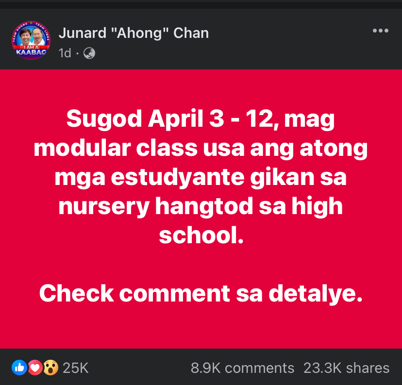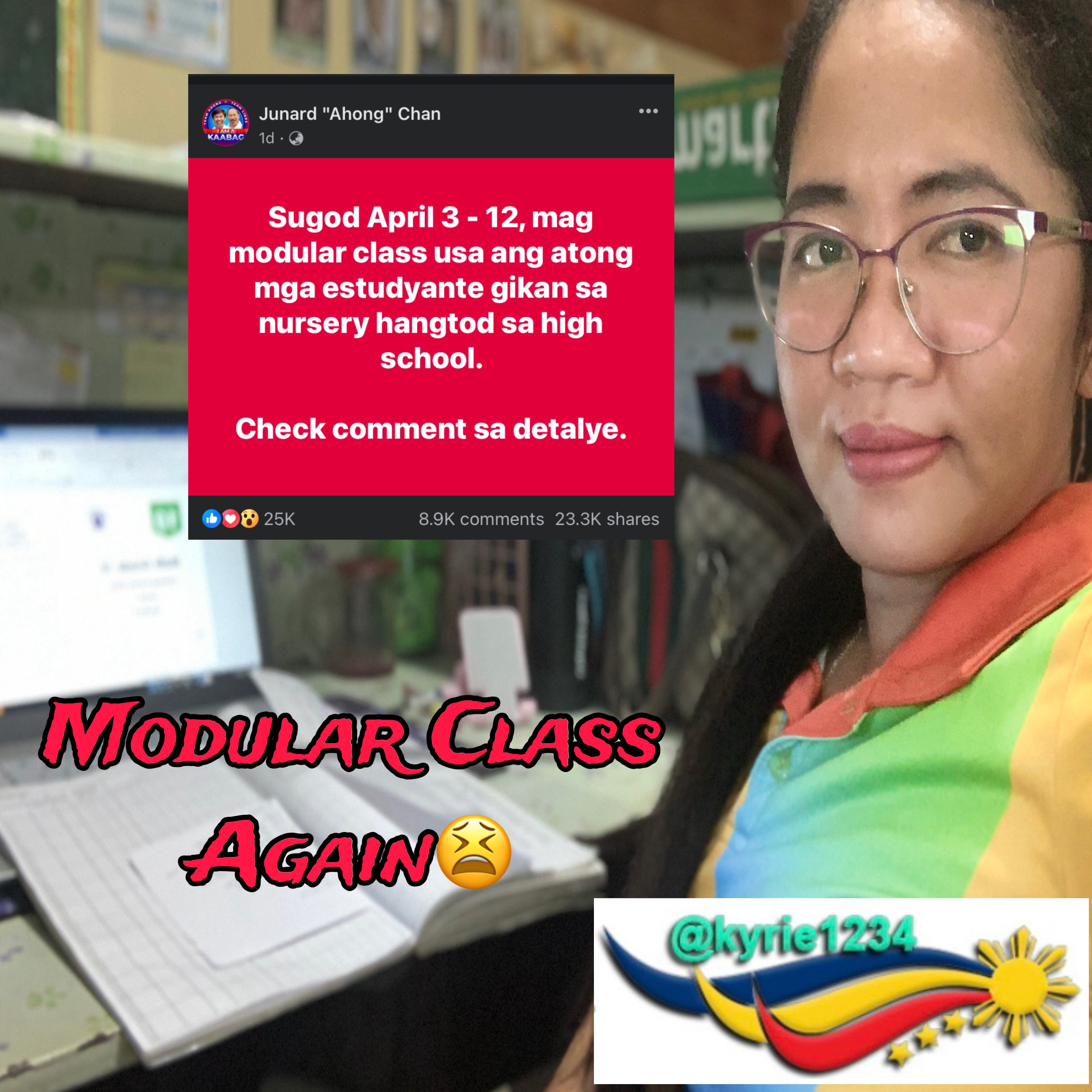 Good thing, before it was too late the Mayor declared automatically that we will be conducting modular class even our modules were not yet ready. So the day after the declaration, we didn't let our students go to school. We just messaged them that we will be preparing the modules and we will just update them as to when they are going to get it.