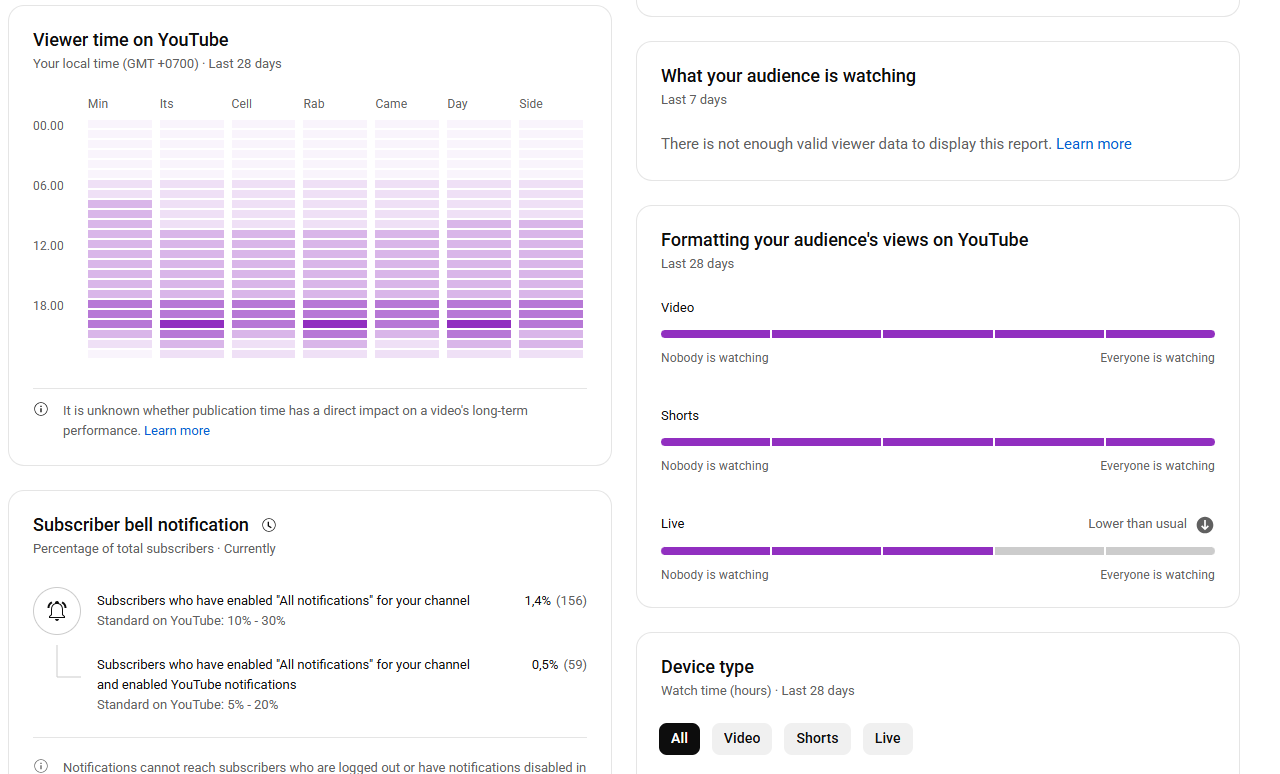 - When Your Viewers Are on YouTube. In this section, you will see the times and days when your audience is most active watching videos on your channel.