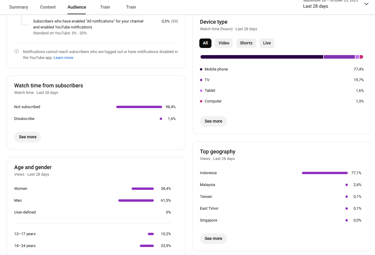 - Geography (Audience Location). By knowing the location of your audience, for example, 80% of your audience is from Indonesia, you can discuss the content using that language and context.