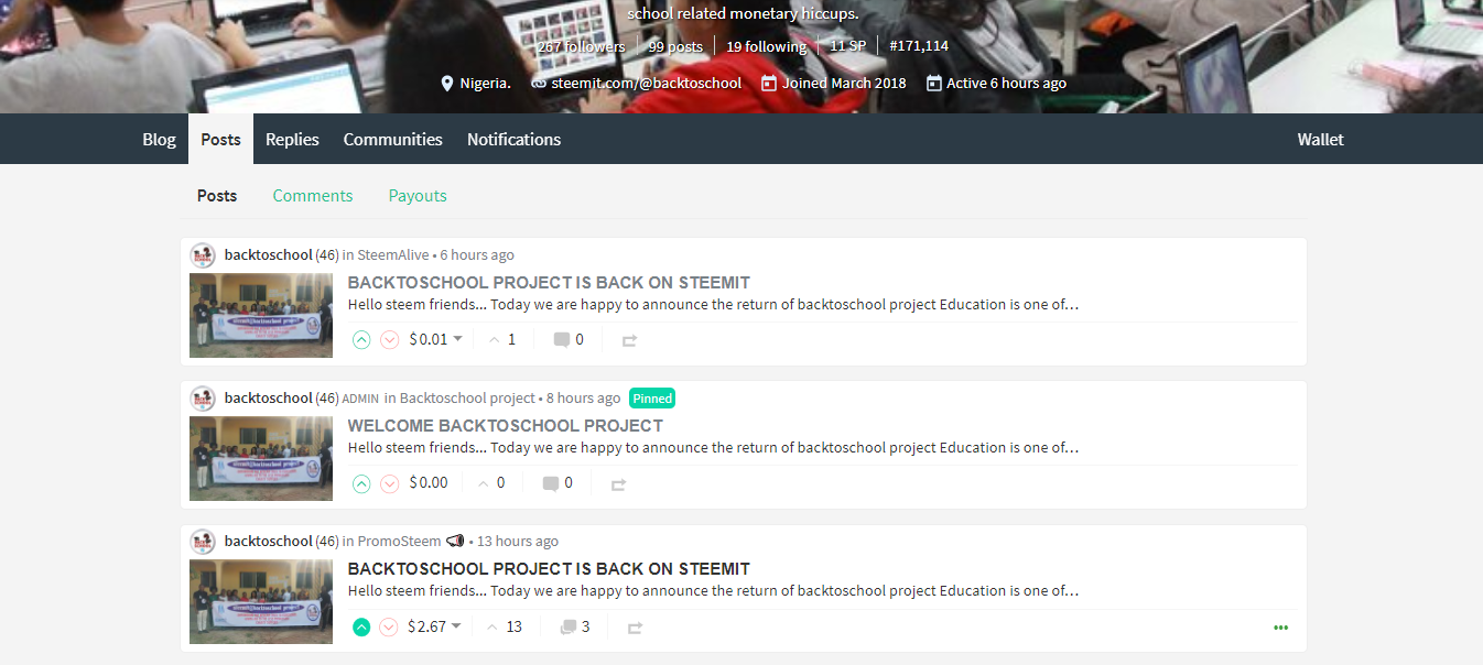 I published the post on promosteem which is the main community it is meant to be published. I pinned the post on backtoschool project community for future reference. Then published it on steemalive when I noticed it is the only community with the highest number of Nigerians so as to increase its visibility among Nigerians.