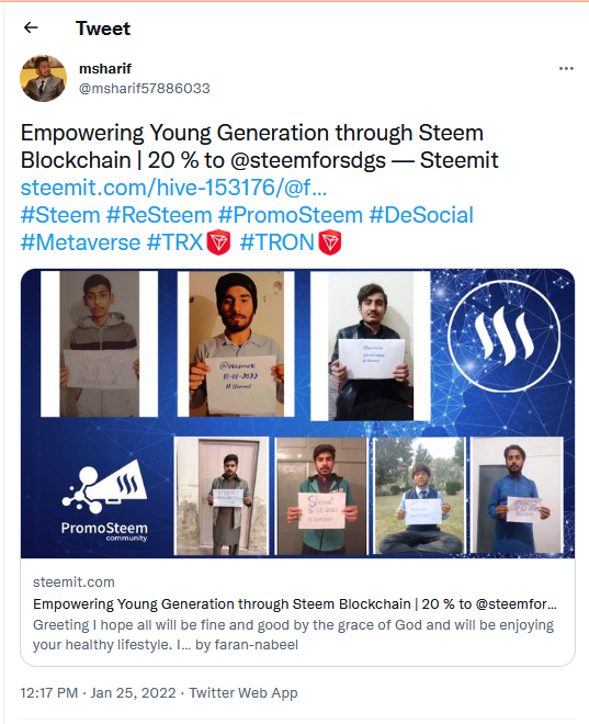 At the end of my post i would like say thanks to everyone and specially the owner and leader (@ponpase, @pojan) of this wonderful community and also thanks to @promosteem.com dor give me opportunity to share my promotional activities with our steem fellows. And also thanks to @sco1 for his great support and appreciation. And also thanks to @ashkhan the promoter of Pakistan. And i also support steemforsdgs project and set my 20 % payout to @ steemforsdgs.