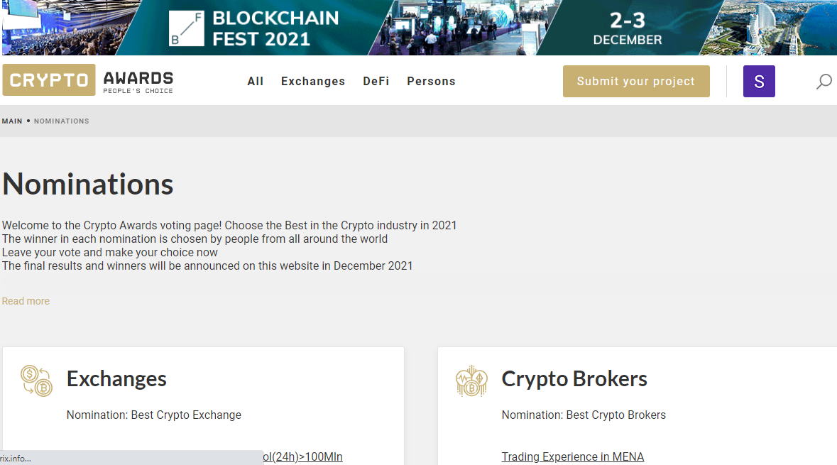 The winner in each nomination is chosen by people from all over the world by voting. Each user can only vote once. Final results and winners will be announced on this website in December 2021 and at Blockchain Fest 2021 which will take place on 2-3 December 2021 in Limassol Cyprus.
