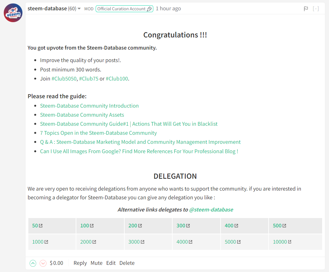 We are very open to receiving delegations from anyone who wants to support the community. if you are interested in becoming a delegator for Steem-Database you can give any delegation you like :