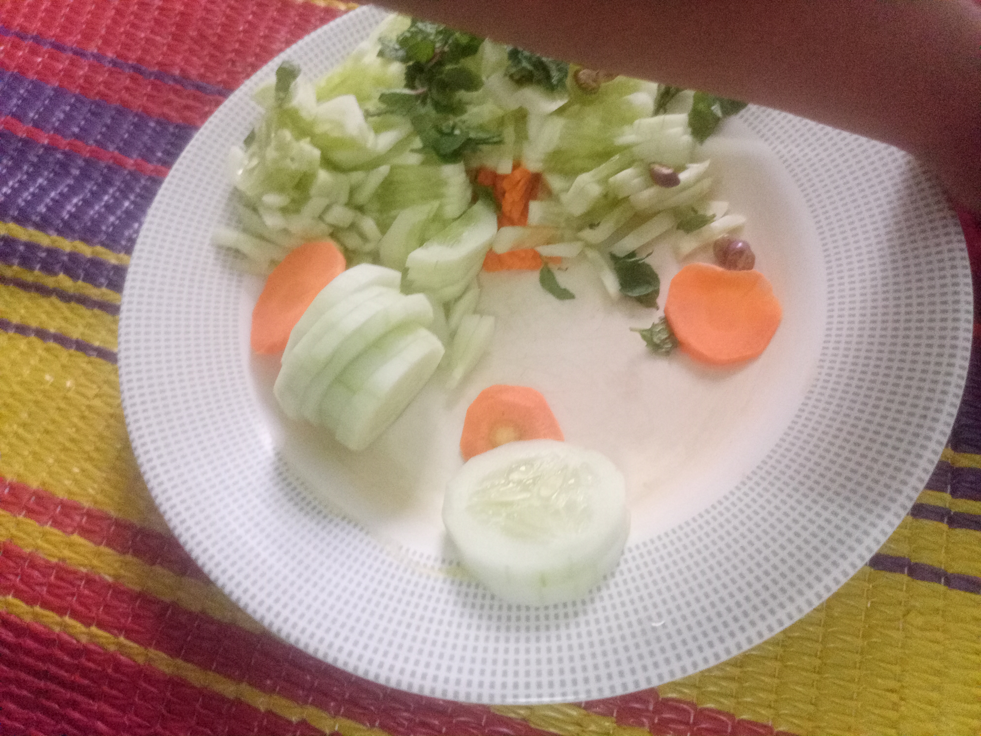 Next is salad. We try to eat salad every day. This salad is an essential ingredient in our iftar. I usually make salad with cucumber, tomato, carrot, mint leaves, and green chili.