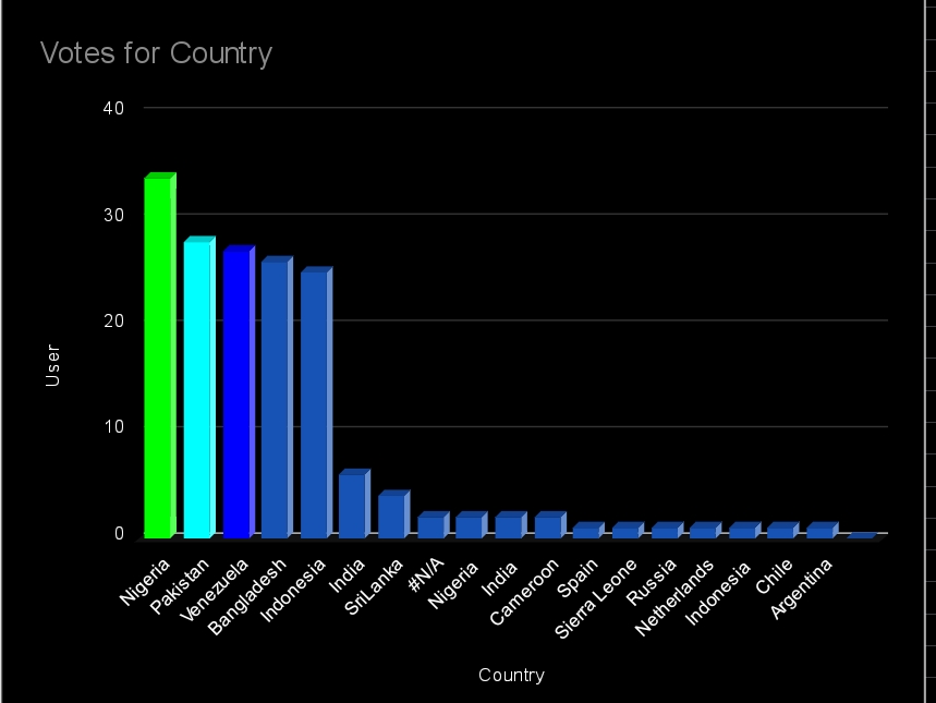 We distributed our votes across 14 different countries, upvoting 165 posts during the week and supporting 148 unique users. Among these users, Nigerians received the most support with 34 upvotes, followed by Pakistan with 28 and Venezuela with 27. We also supported users from Chile, Sierra Leone, Argentina, the Netherlands, and Spain.