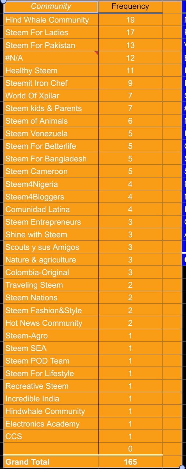 We supported posts in 32 different communities and 12 personal blogs. The Hindwhale community led with 19 upvotes, followed by Steem for Ladies with 17, and the SteemFor Pakistan Community with 13 votes.