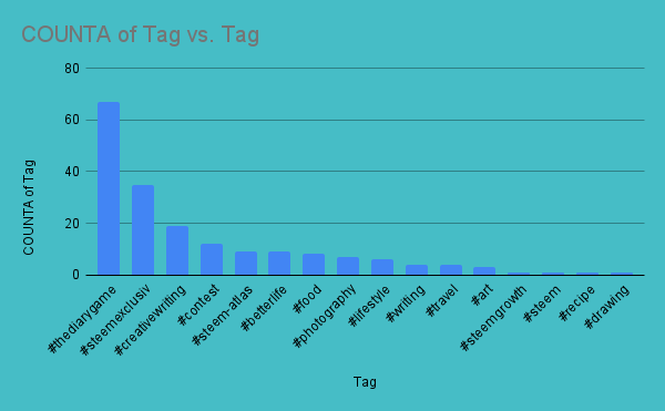With 16 tags visited, thediarygame had the most tags 67, followed by steemexclusive 35, creativewriting 19, contest 12 and other tags.