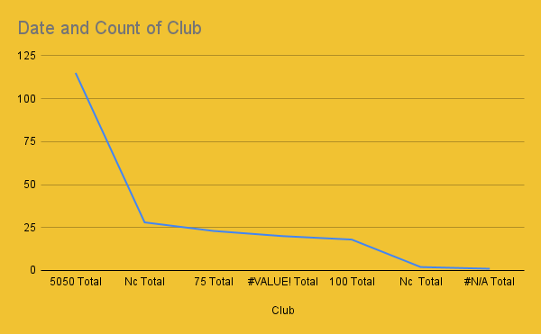 When we visited, we found that the most clubs I found were Club5050 - 115, club100 - 18. club75 - 23 and NC only 28.