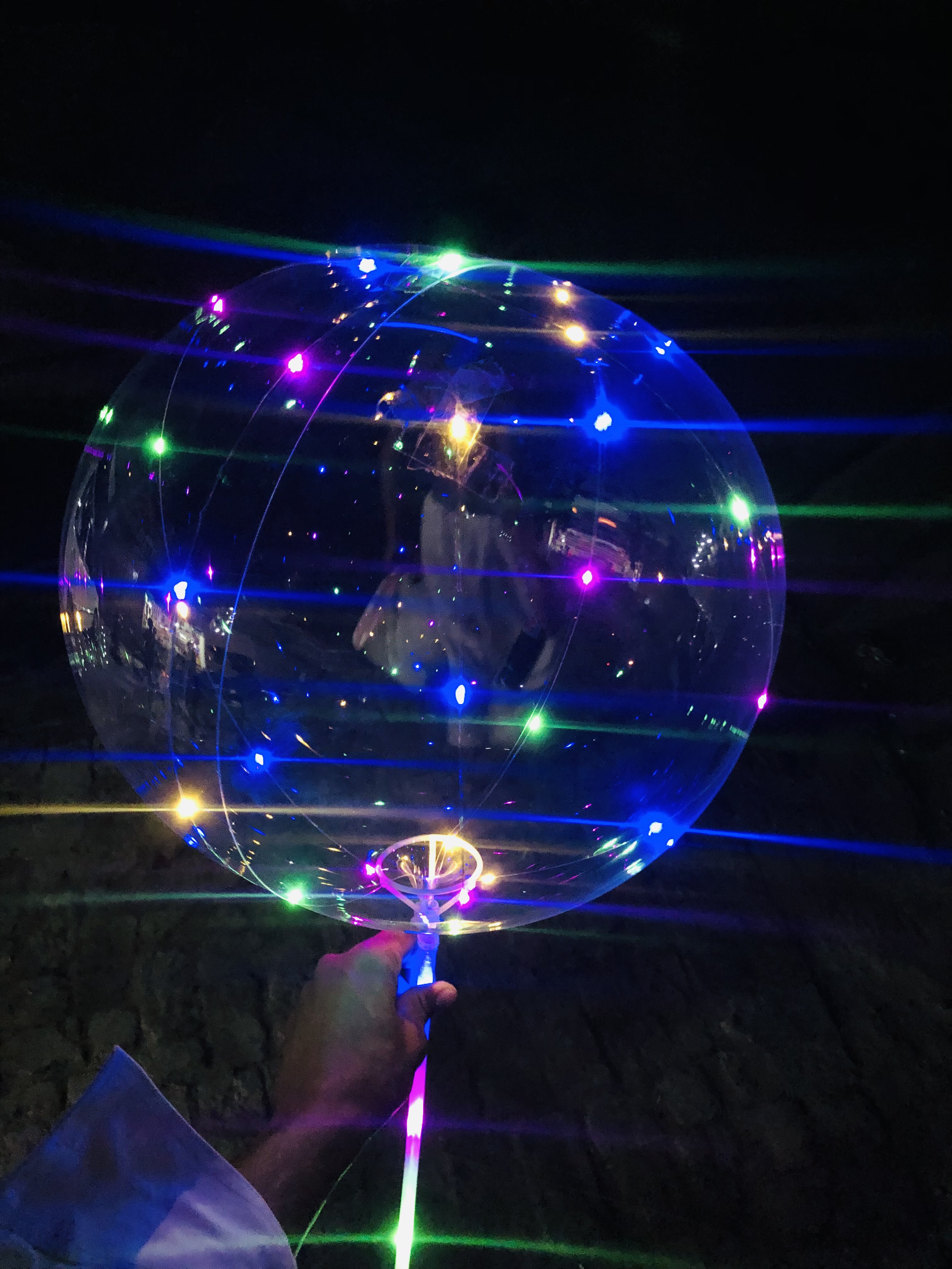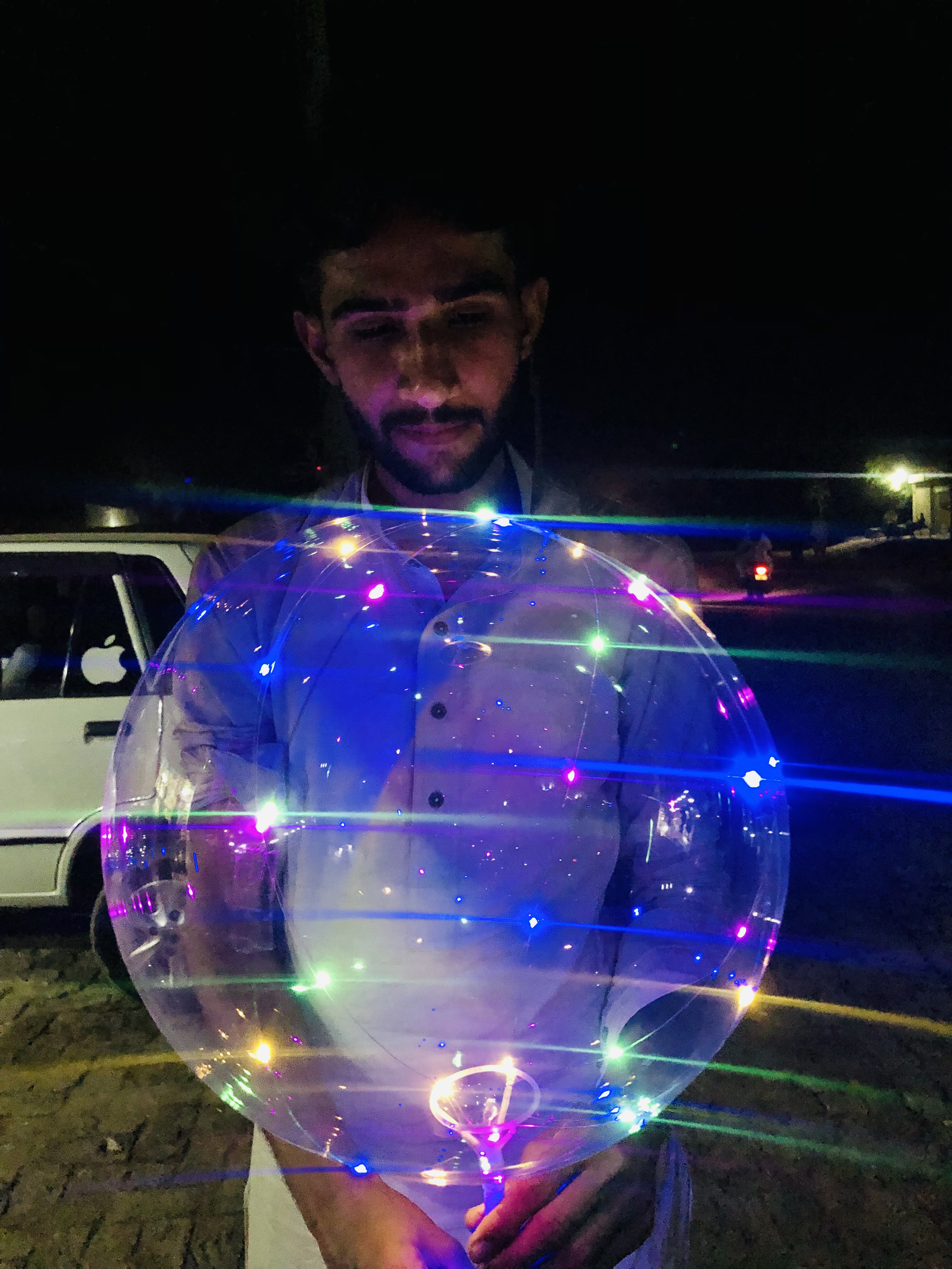 It is attached by a handle . Inside the balloons light are attached. The wire of light are attached with battery. And battery is attached is handle stick. This led light is work is 8 hours. It is use almost night parties.