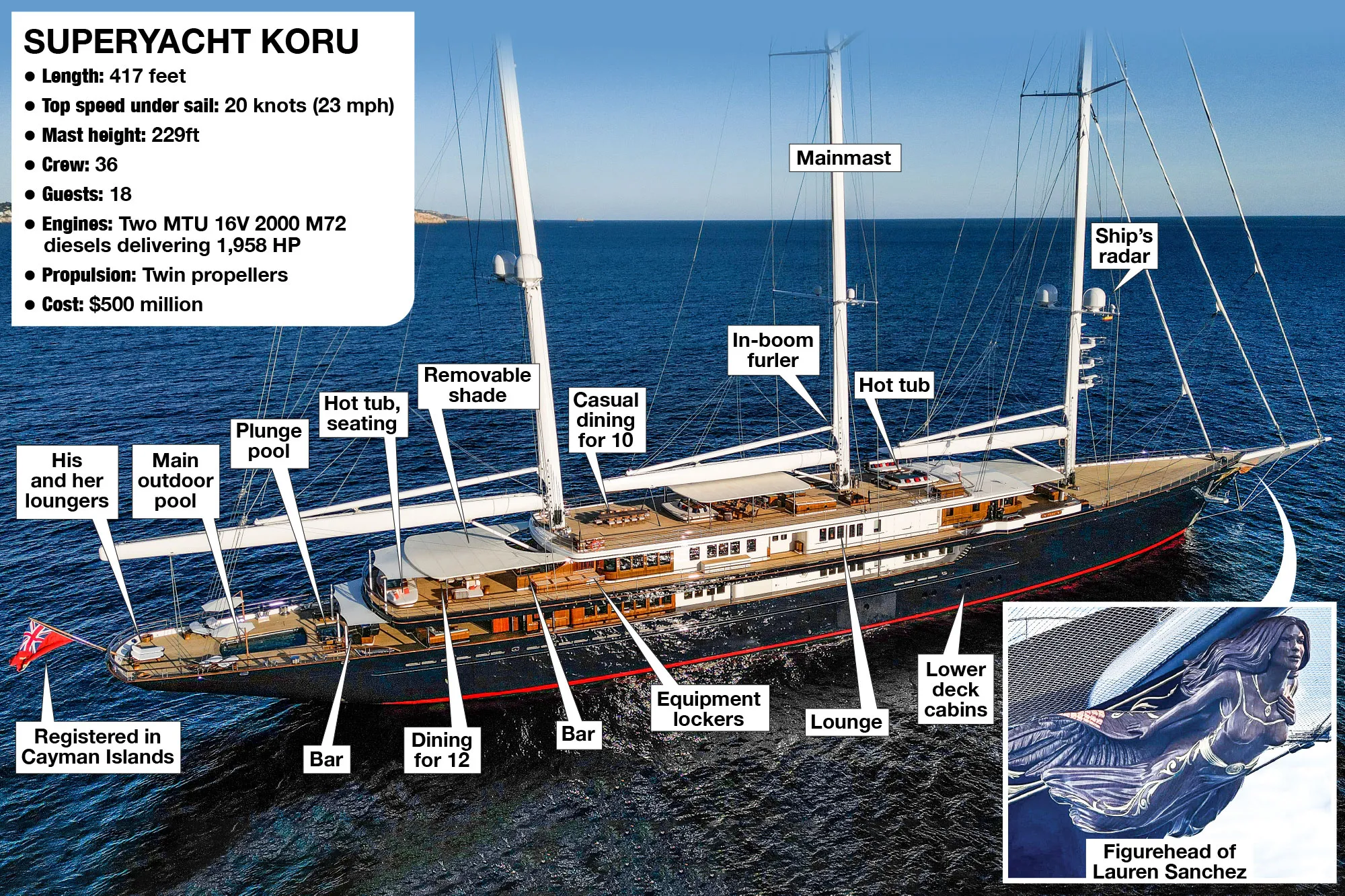 The 127-meter premium bespoke superyacht "Koru" belongs to Amazon founder Jeff Bezos. At a cost of $500 million, Oceanco erected it in the Netherlands. The biggest sailing yacht in the world, it is a schooner rigged sailing vessel that was delivered in April 2023. With a 3,300 GT tonnage, it can accommodate 18 passengers and needs 40 crew members. The Maori term "Koru" means "coil" or "loop," and in traditional Maori art, it represents fresh life, development, and tranquilly. The boat set off on its first trip in April 2023.