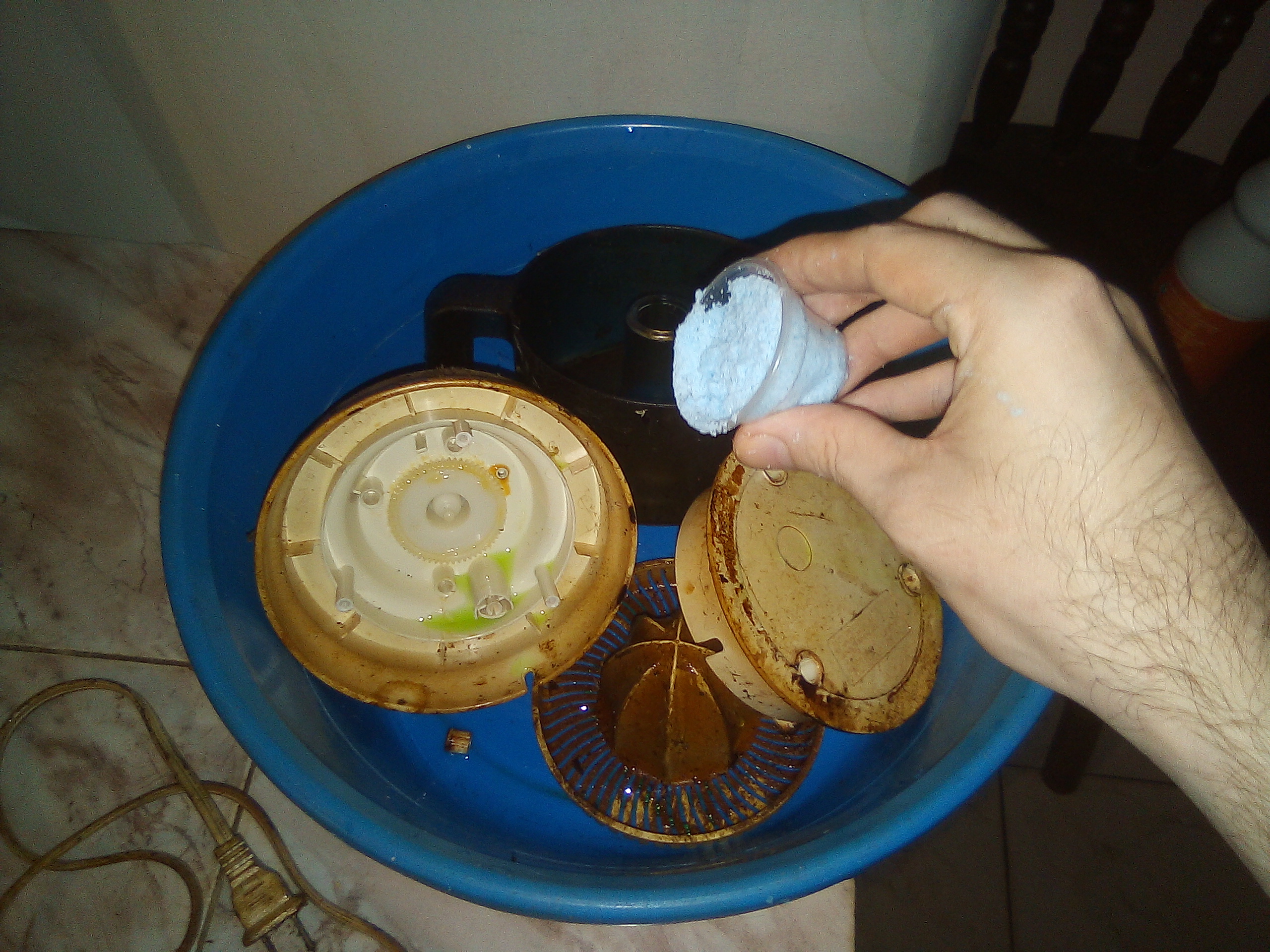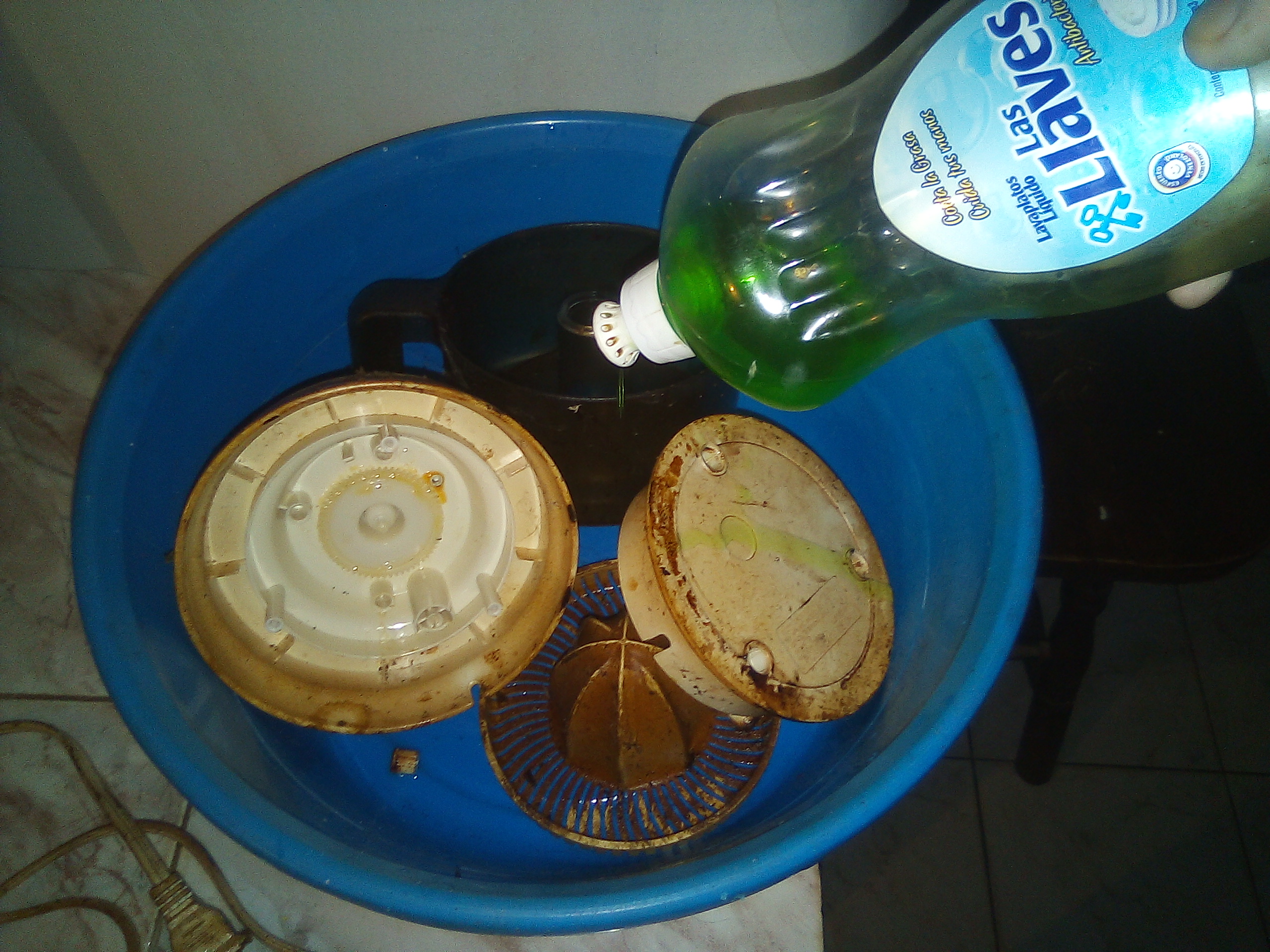 Lo primero que hice fué desarmarlo en piezas que posteriormente fuí metiendo en un envase para luego lavarlo. Mi intencion inicial era enchufarlo para ver si funcionaba, pero supuse que aun de funcionar iba a estar pegado de tanta grasa acumulada, asi que simplemente me dispuse a limpiarlo.