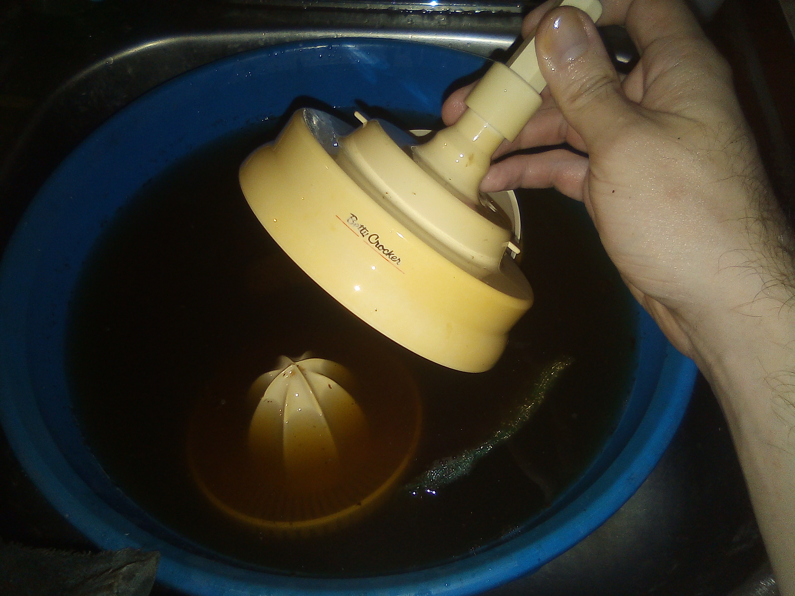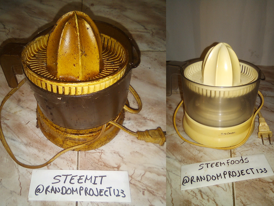 Caminando por una calle del centro de la ciudad, encontré esto, un exprimidor de naranjas completamente lleno de grasa y mugre. Lo vi en una pequeña caja al lado de una bolsa debasura, al principio seguí caminando como si nada y metros despues mi cabeza hizo click y dije "ey, esto tal vez funciona". Me devolví y tengo que admitir que con mucha vergüenza de agarrar basura de la calle, traje el pequeño artilugio a casa.