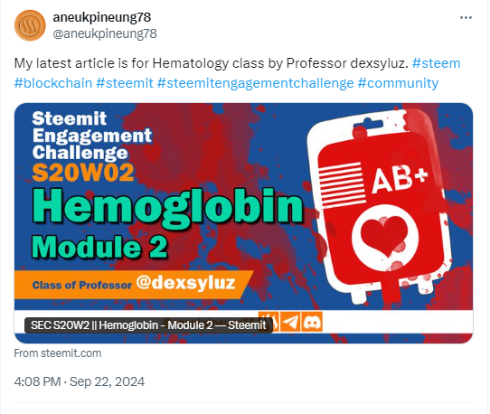 This is my homework post for Steemit Engagement Challenge Season 20 Week 2 assignment of Professor @dexsyluz’s class, Hemoglobin.