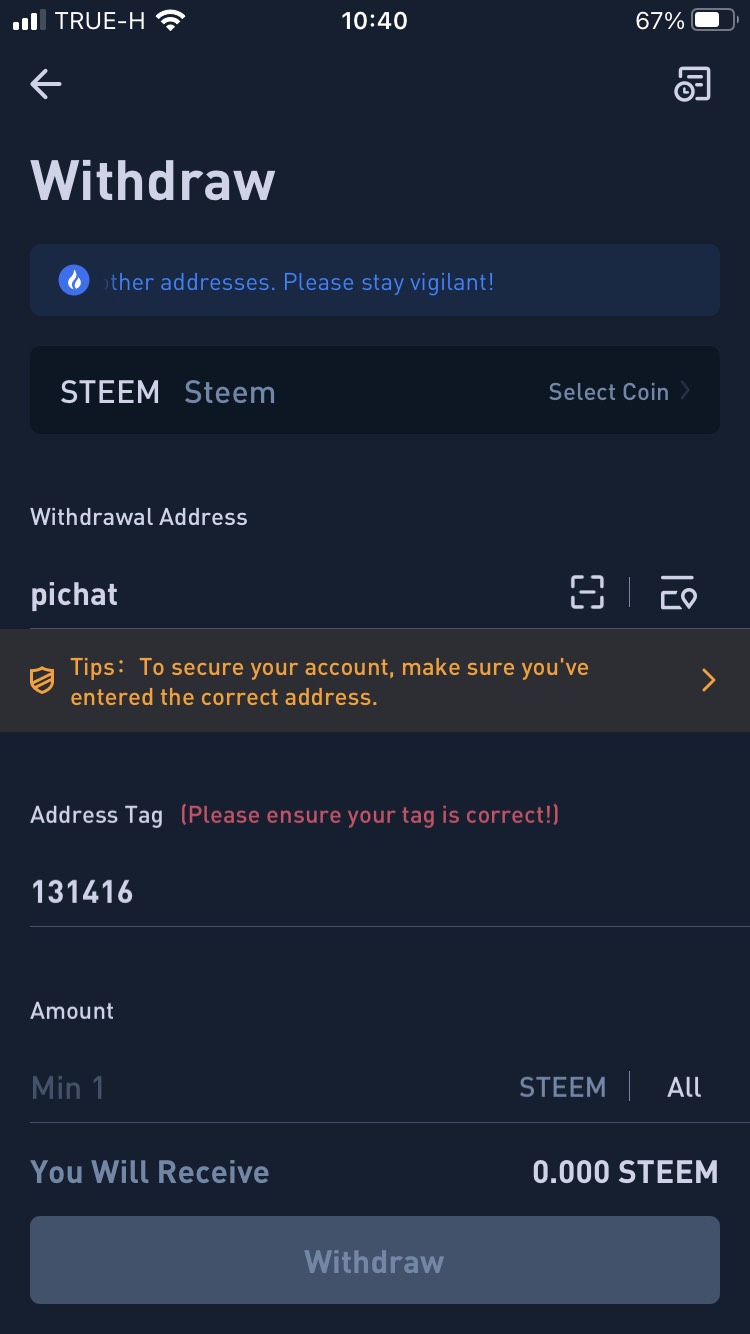 ซึ่งปัญหาคือเราไม่รู้ว่าเราจะใช้ Address Tag อะไร ตอนแรกผมก็งง และติดตรงนี้ เพราะตอนที่เราถอนมา แต่ละ Exchange จะมี Address Tag ให้เราระบุ และเพิ่งรู้ตอนนี้ว่า Address Tag เราต้องตั้งขึ้นเอง ก่อนการถอนเราต้องไปทำการเพิ่มบัญชี Steem ที่อยู่ของเราใน steemit นั่นก็คือชื่อบัญชีของเรานั่นเองและทำการตั้ง Address Tag ด้วยการคลิ๊กที่ปุ่ม