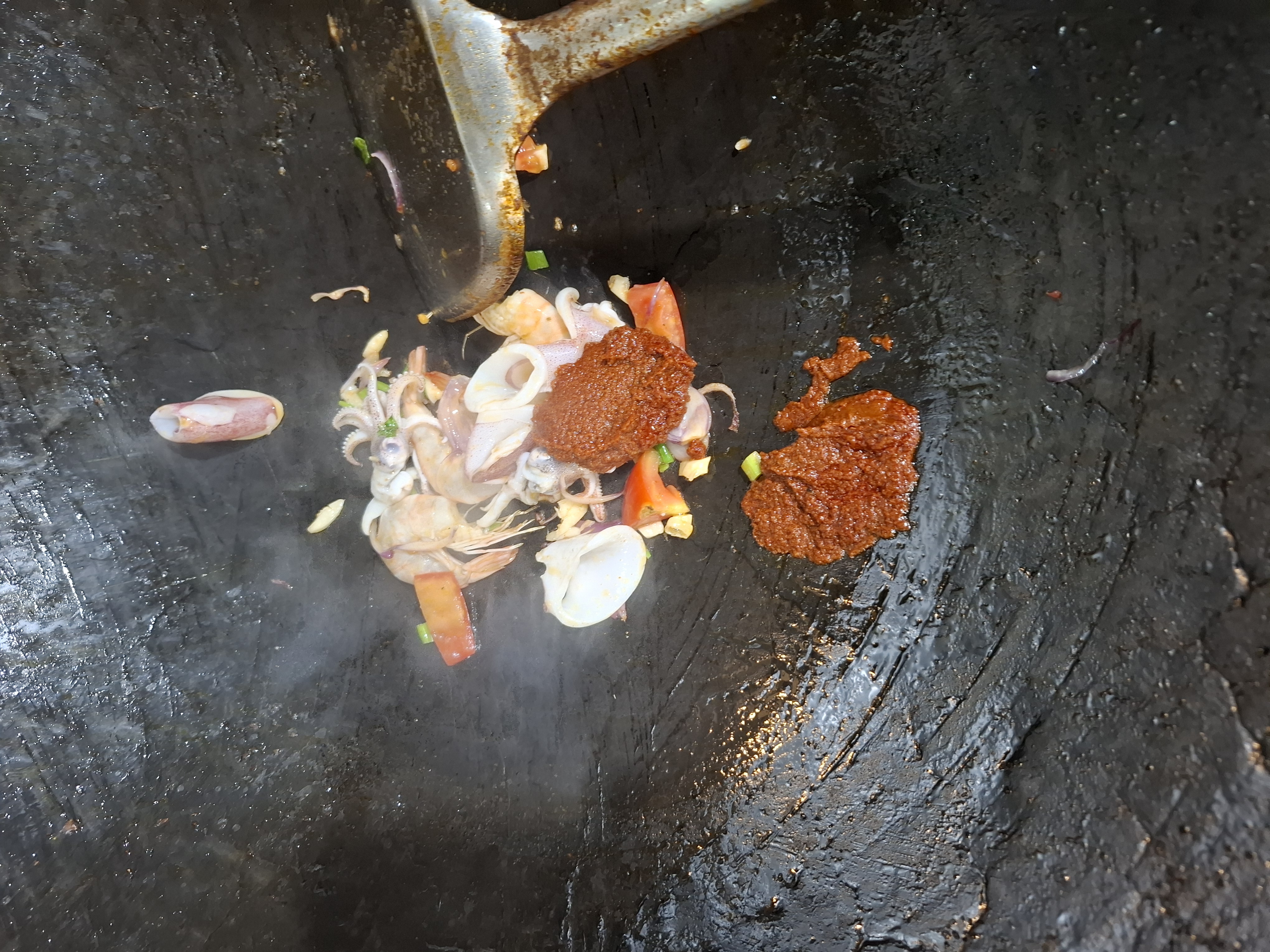 Lalu masukkan semua bahan awal untuk menumis sampai harum kemudian masukkan Bumbu satu sendok makan bila mau pedas masukkan dua sendok untuk mendapatkan rasa bumbu yang melimpah dan kental juga pedas, yang saya gunakan satu sendok penuh aja.