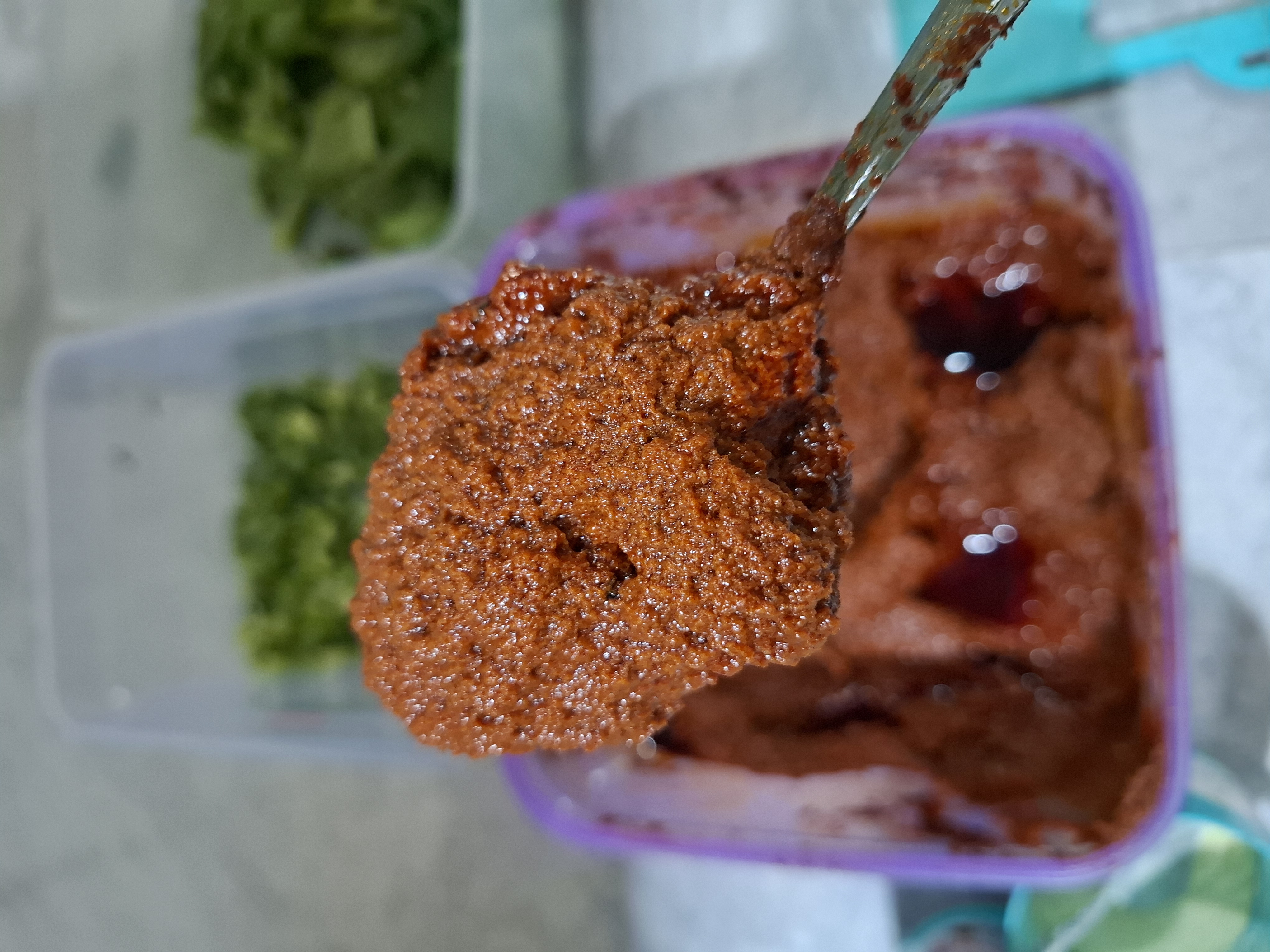 Ini warnanya berubah dari merah ke merah pudar dikarenakan bumbunya saya simpan dikulkas sebagai stok jadilah warnanya agak luntur menjadi sedikit kecoklatan tapi untuk rasa tetap sama dan harum.