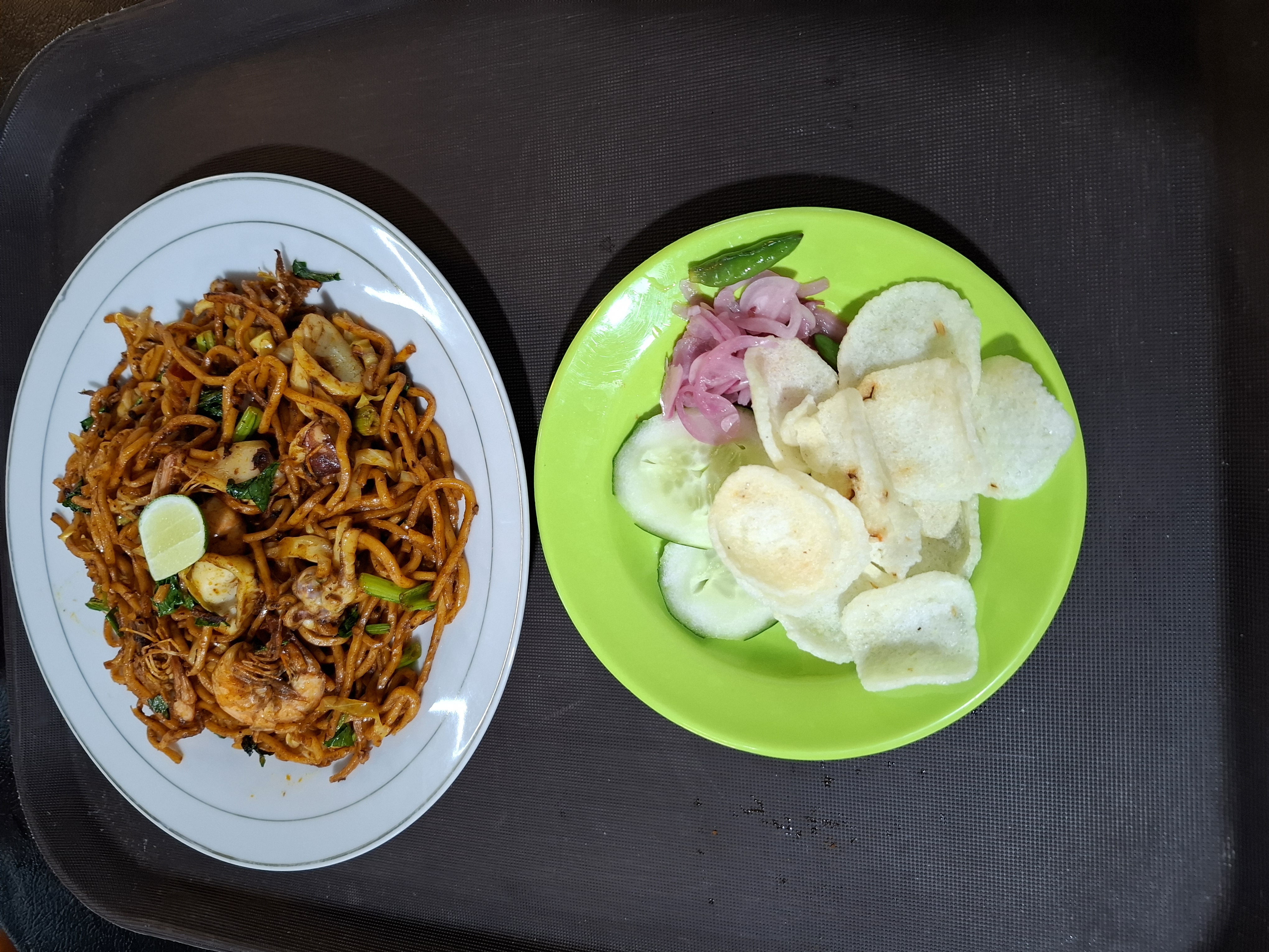 Mie siap untuk dihidangkan dengan tambahan bawang acar, timun dan kerupuk. Tidak lupa ada jeruk nipis yang menancap diatasnya.