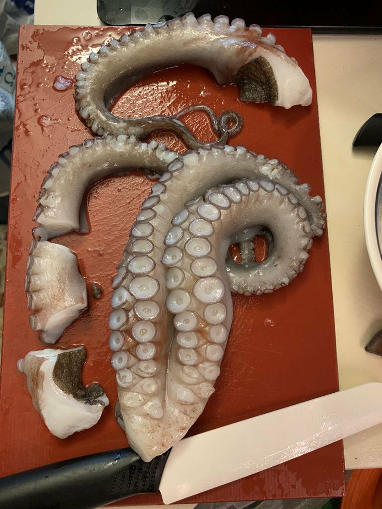 • You must buy: long pasta, tomato sauce, fresh basil, garlic, octopus, salt and pepper, olive oil.