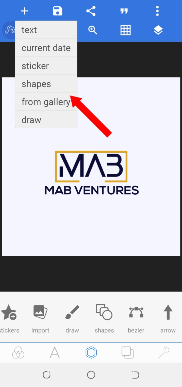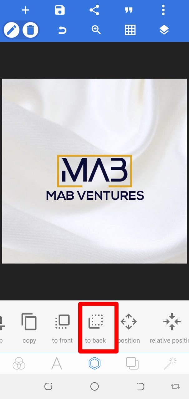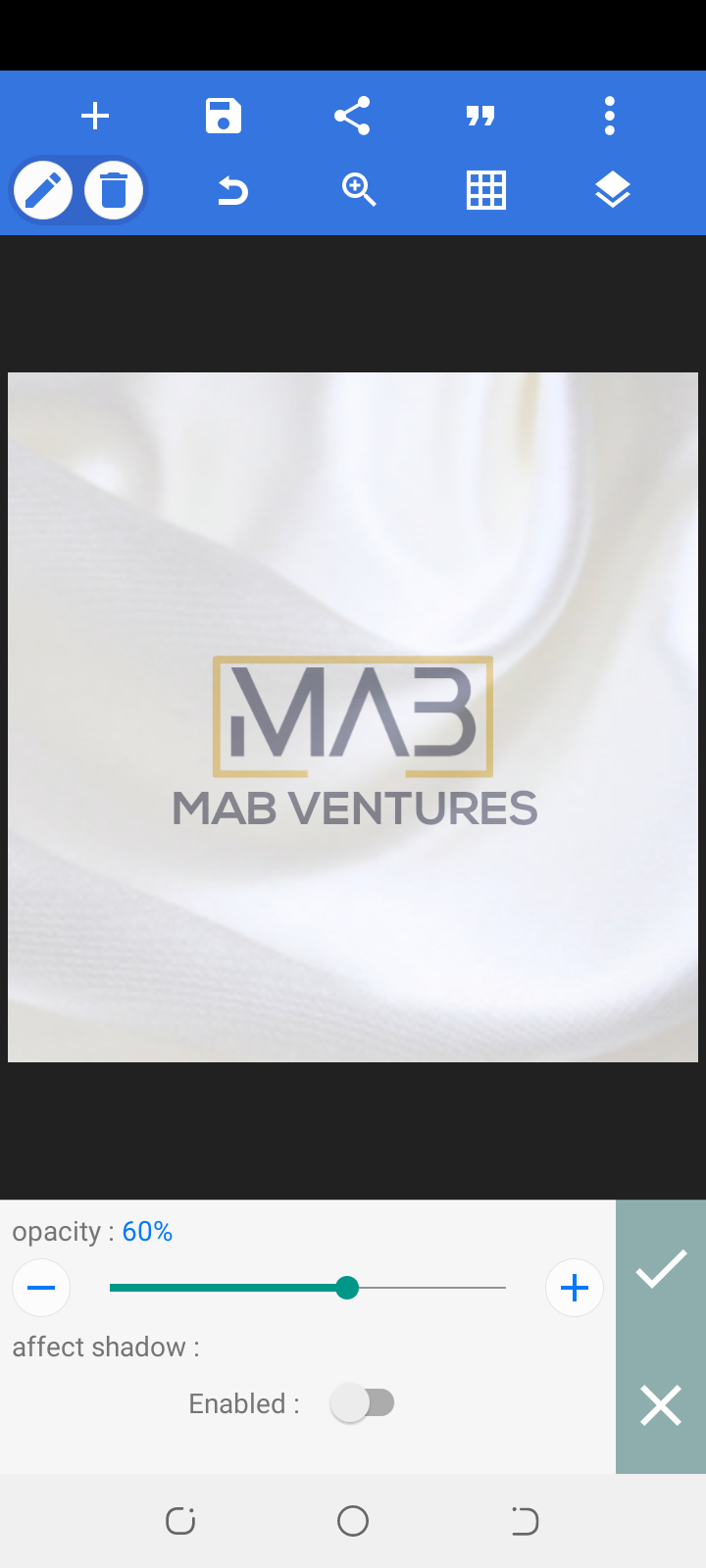 • I added another text "MAB VENTURES" by clicking on the text icon then clicked on from gallery option to get a downloaded background picture from my gallery folder. I reduced the opacity to 60%