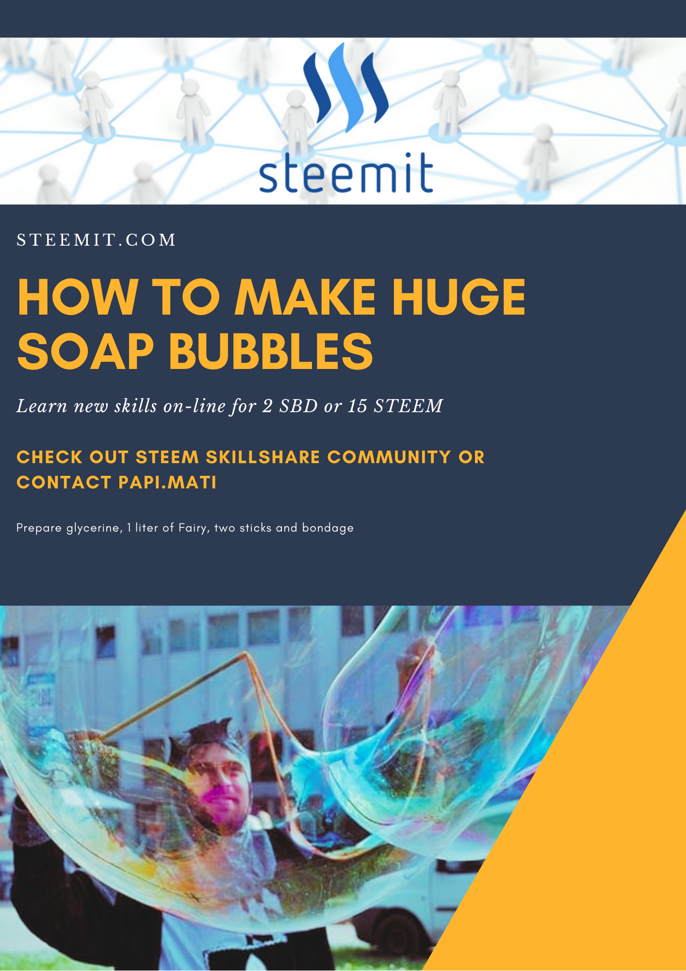 The cost of the workshops is 2 SBD or 15 STEEM. It should take up to 1 hour. After this time you should already know how to make huge soap bubbles so you can continue without my help.