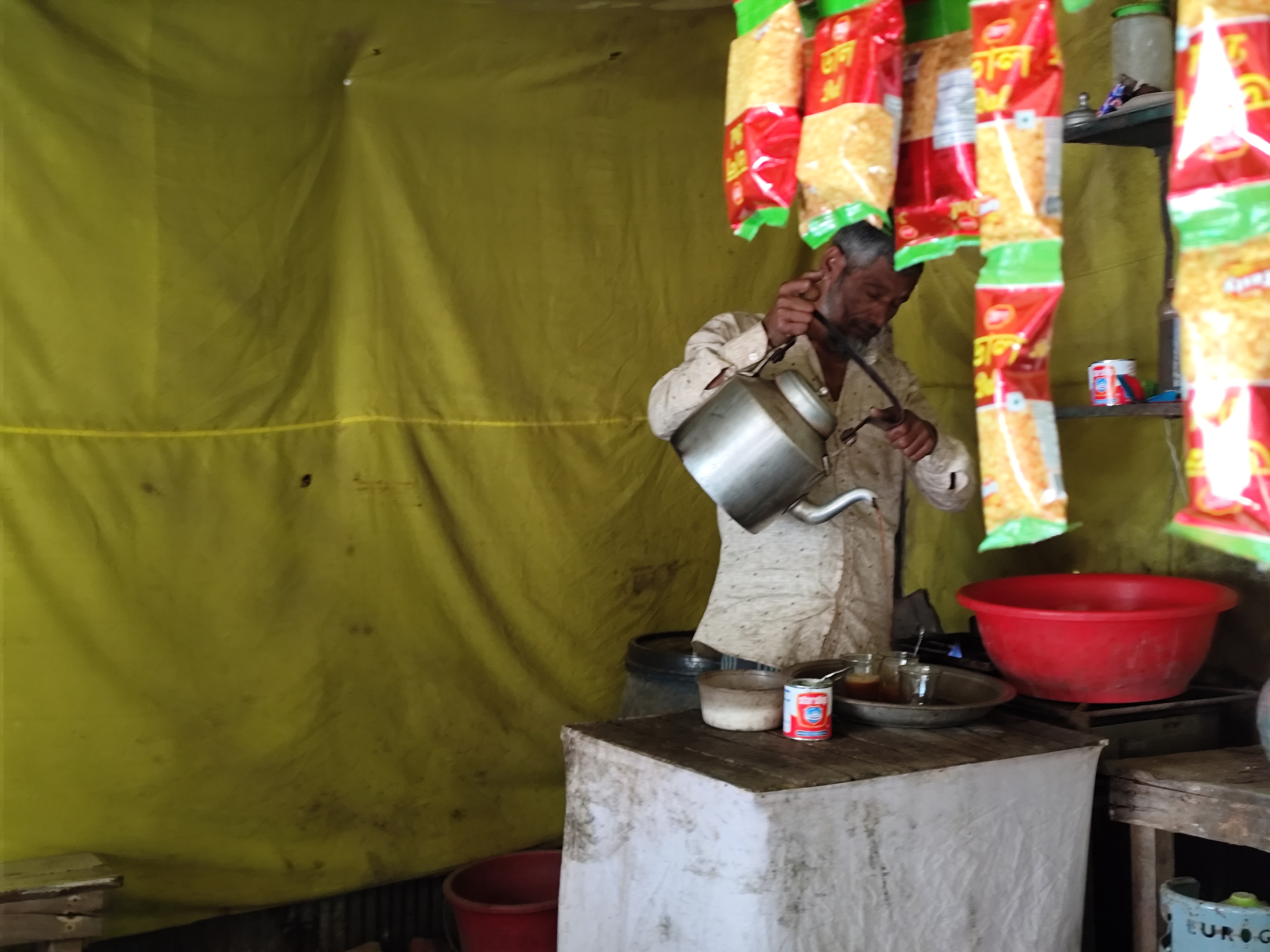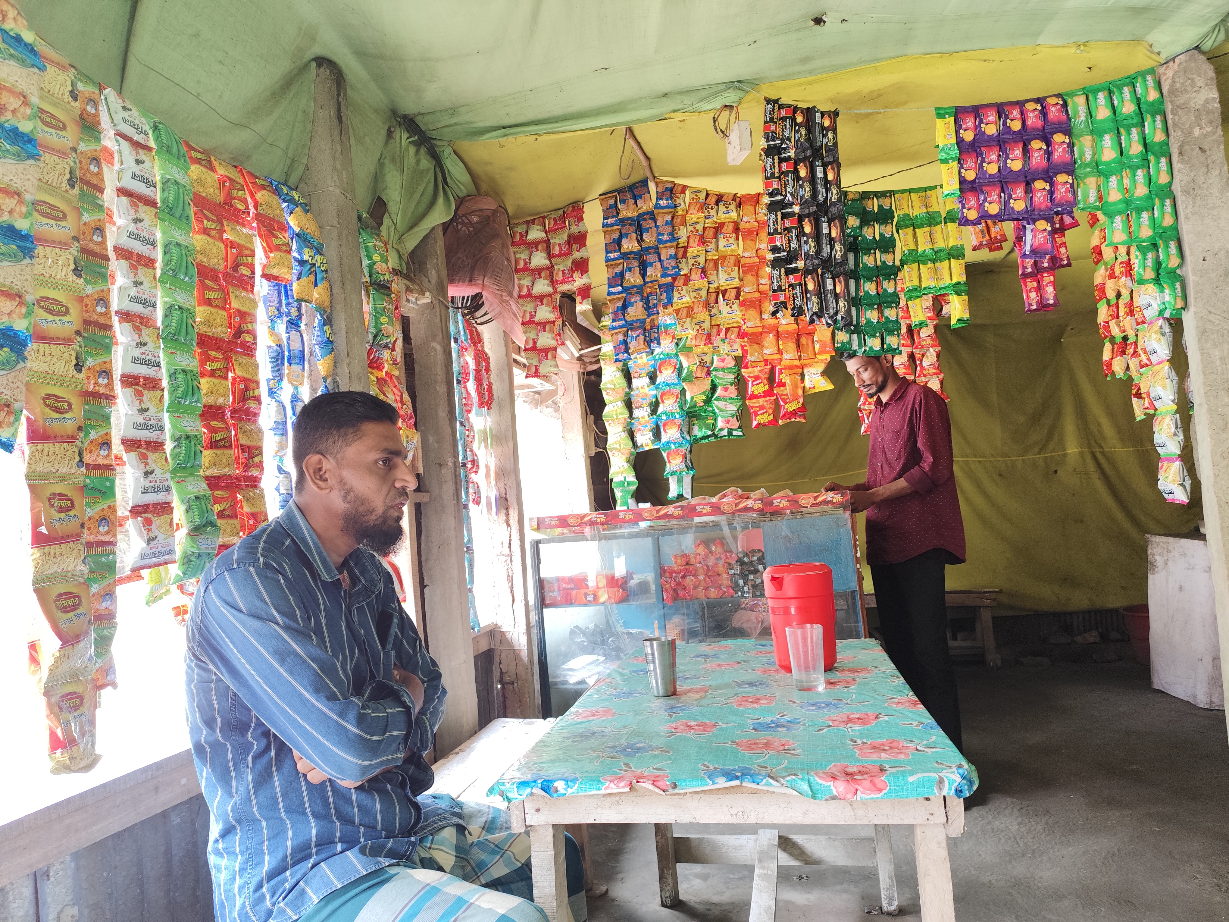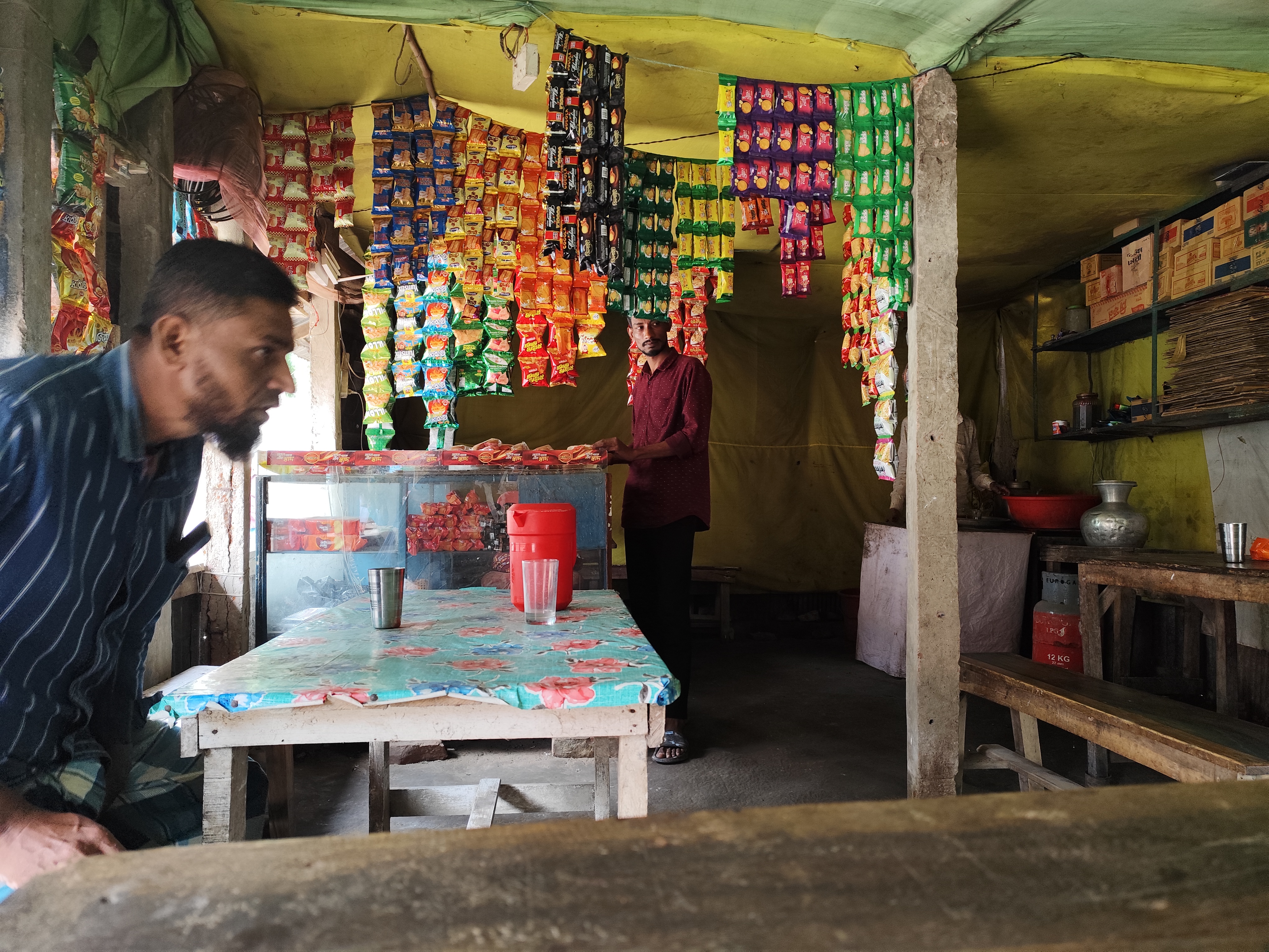 And besides tea, he kept biscuits, Chanachur and good quality Tyakha biscuits. Moreover, he kept the different types of chips and small biscuits that can be seen here. And in the afternoon and evening, people from around come to this shop and chat. And at that time, there is no place to sit in the shop. Because many customers come to his shop at that time and have breakfast and chat. In other words, his shop is like a meeting place. Here, they can inquire about each other and meet each other. And the young people sit in his shop, have breakfast and spend some time.