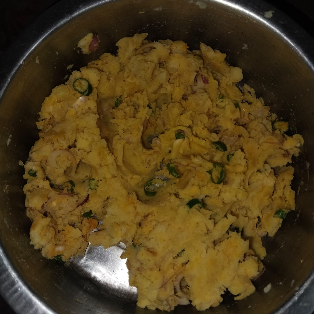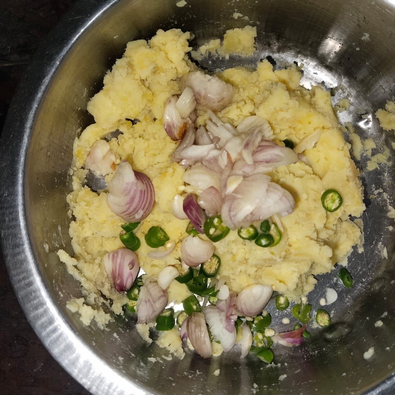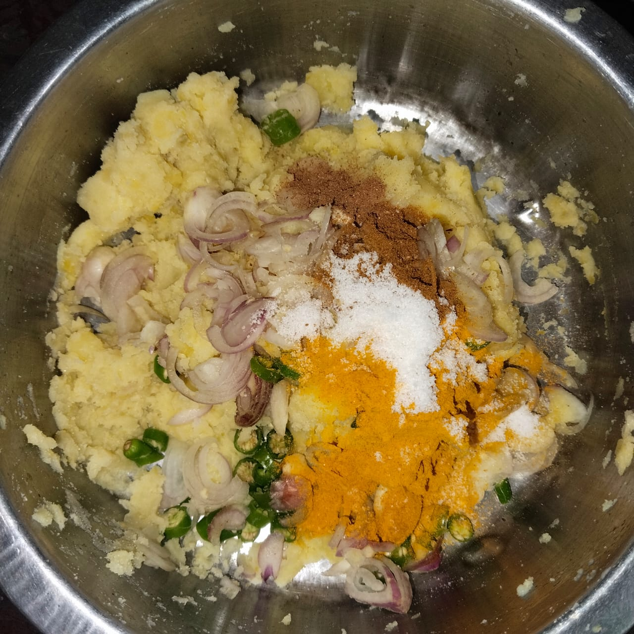 Step-2: I add chopped onion, garlic and chilli to the mashed potatoes one by one, then add salt, turmeric, cumin and chartreuse masala and mix well with my hands.