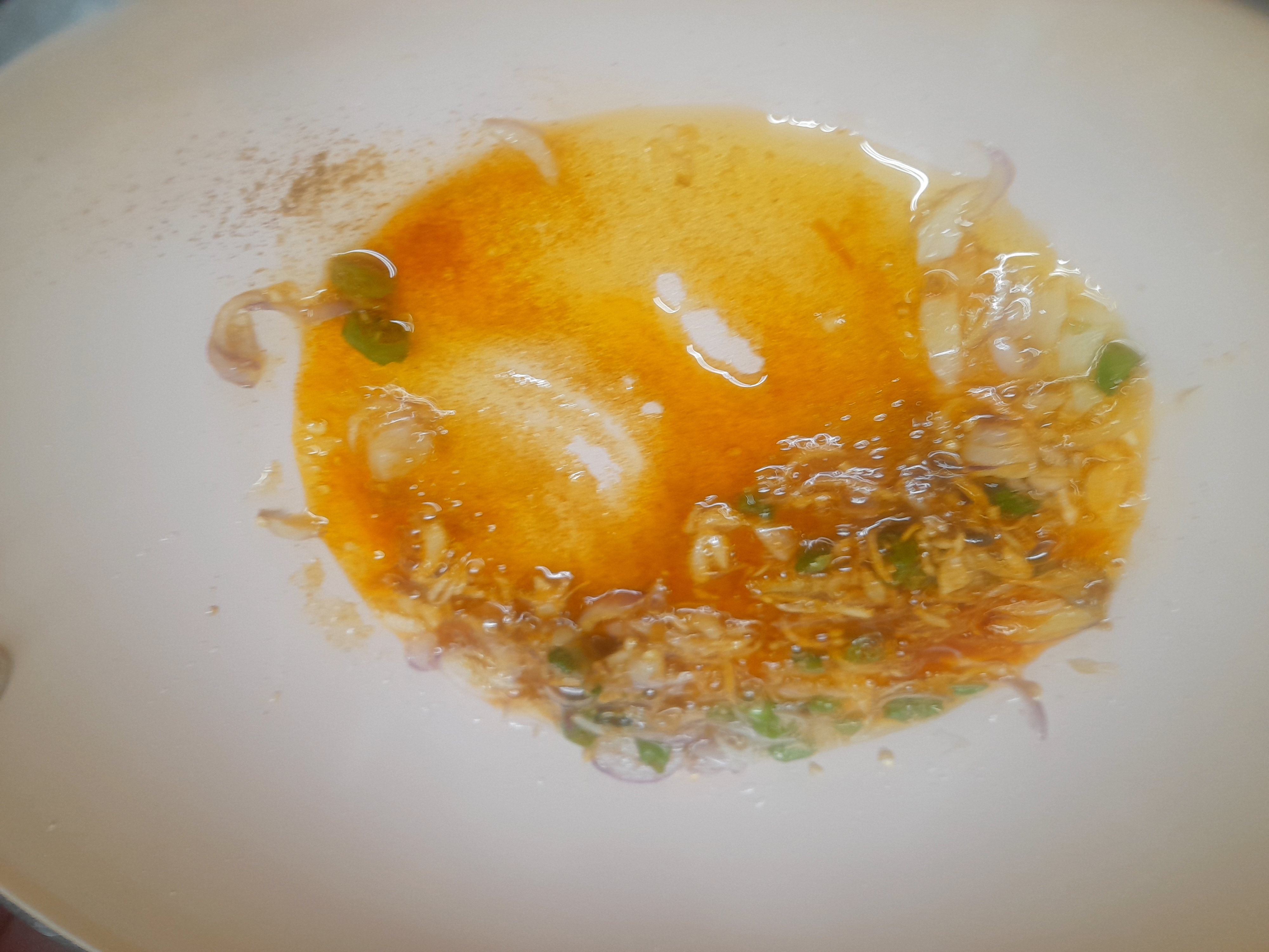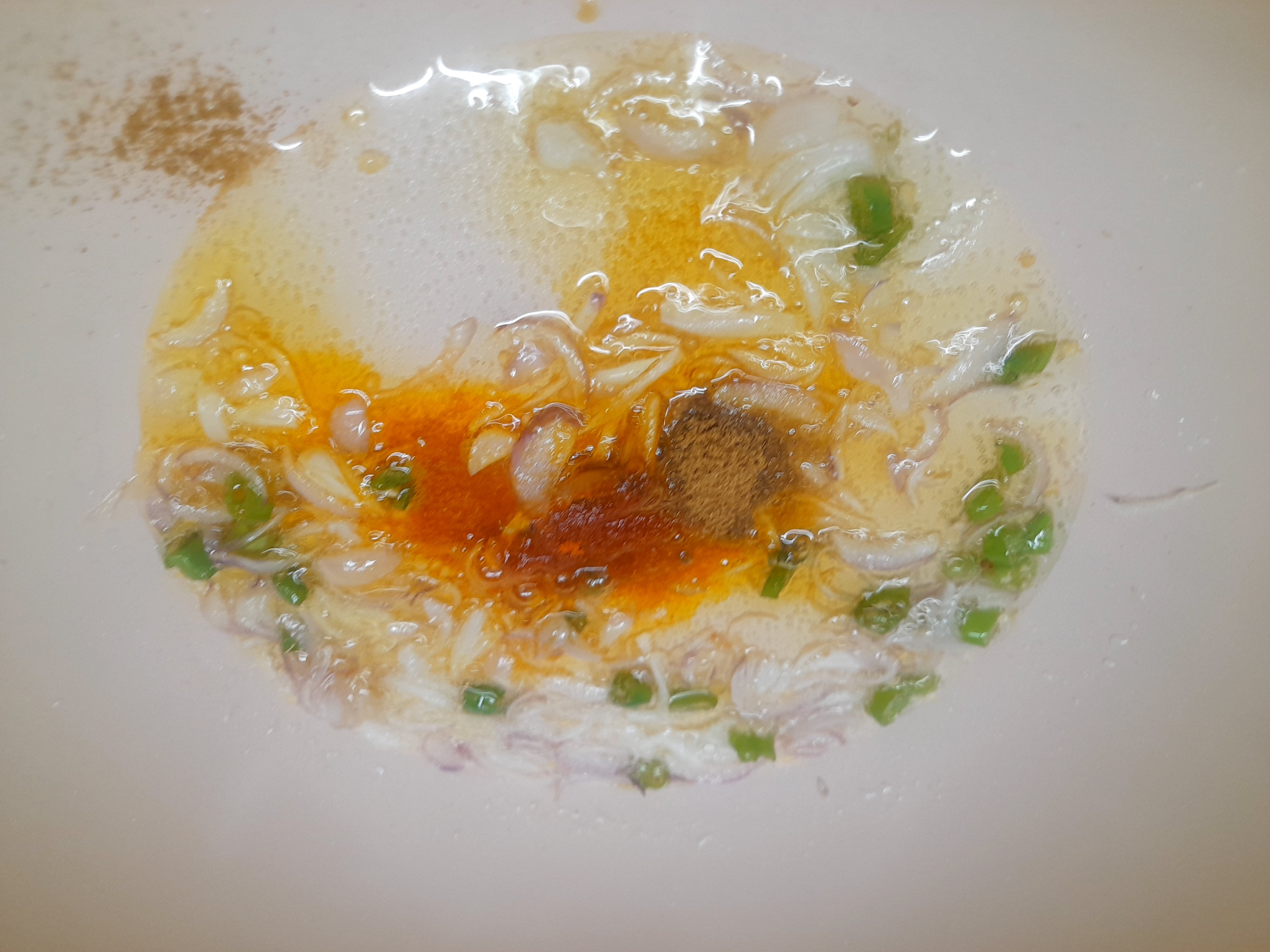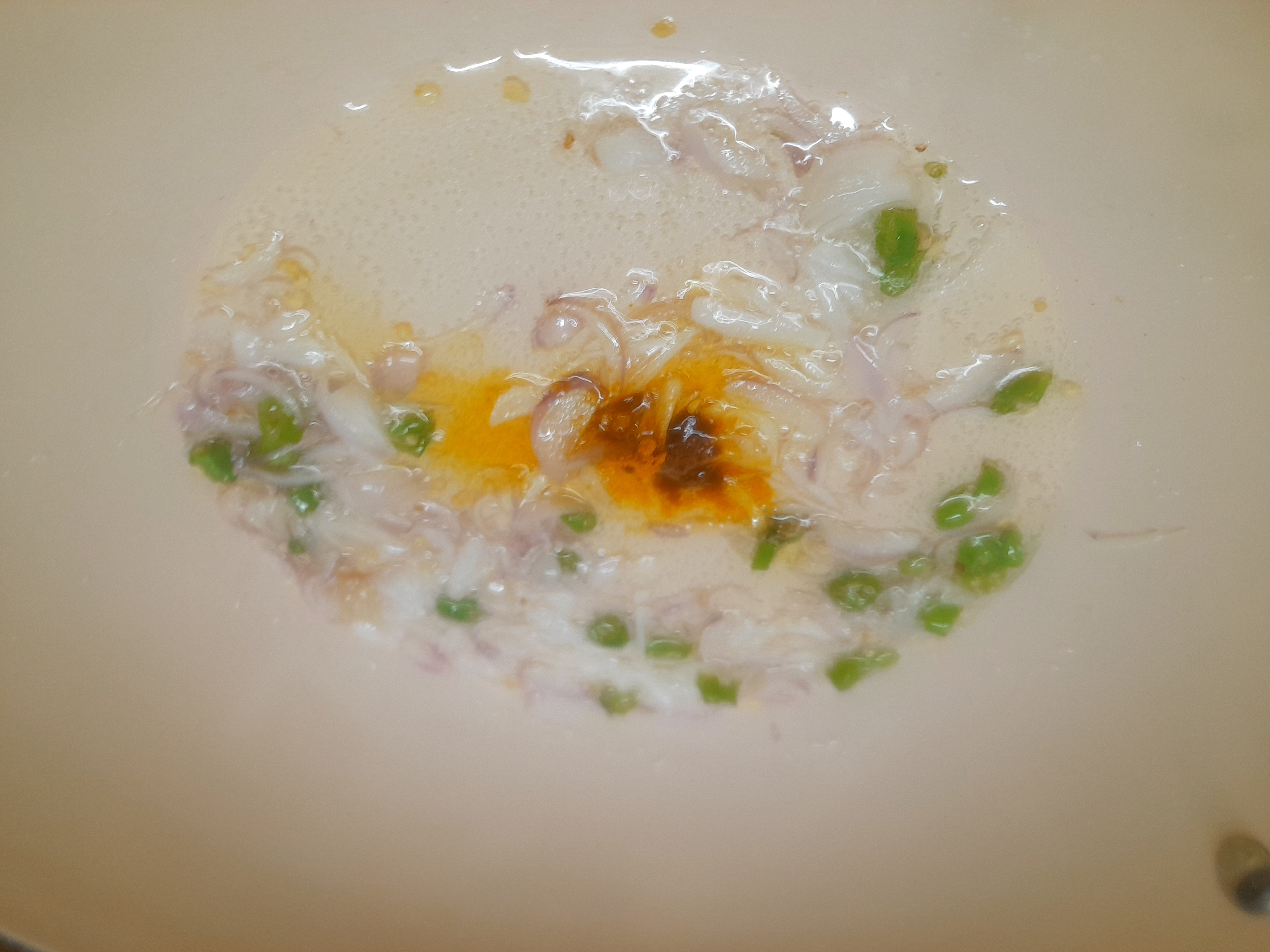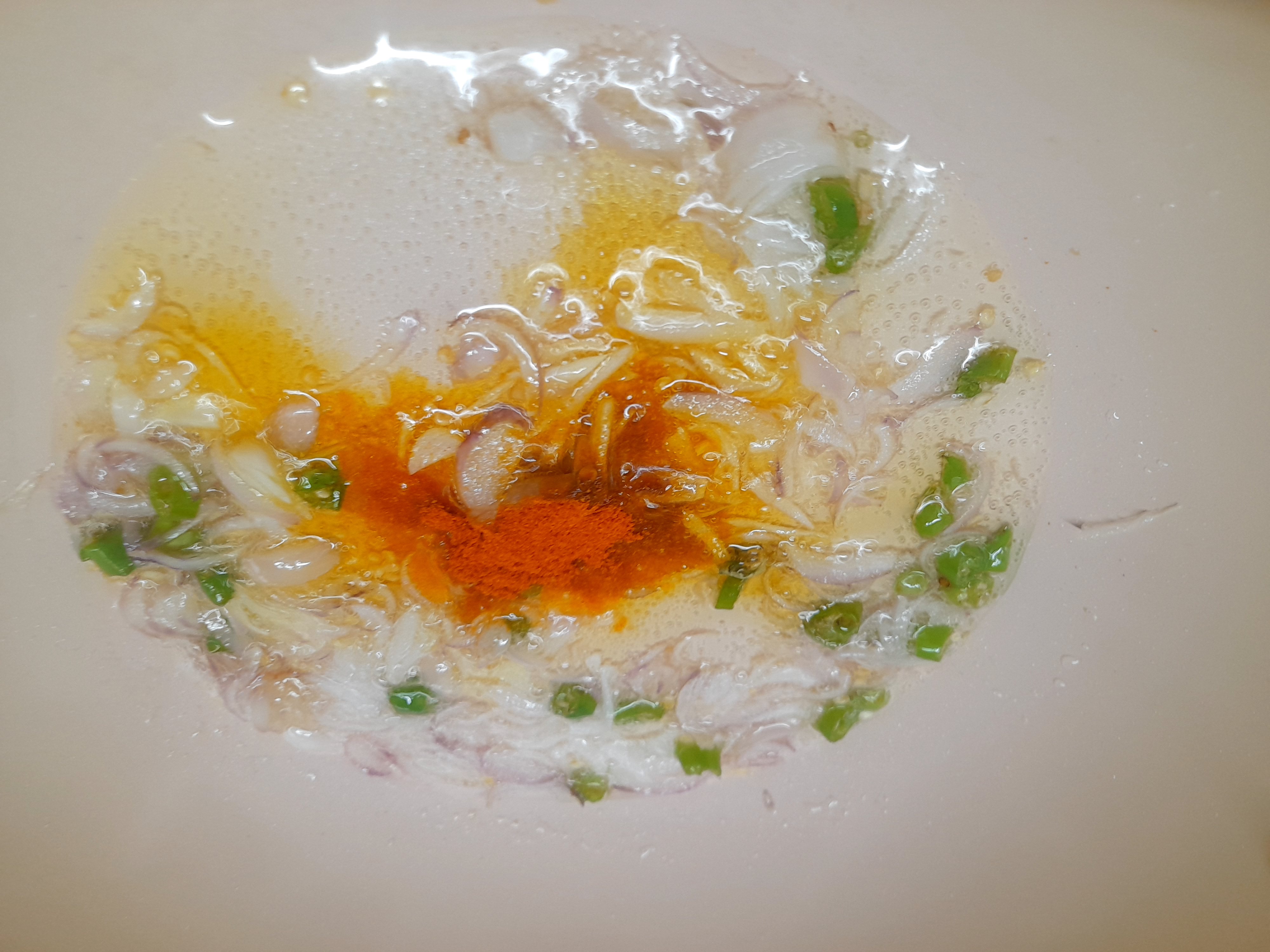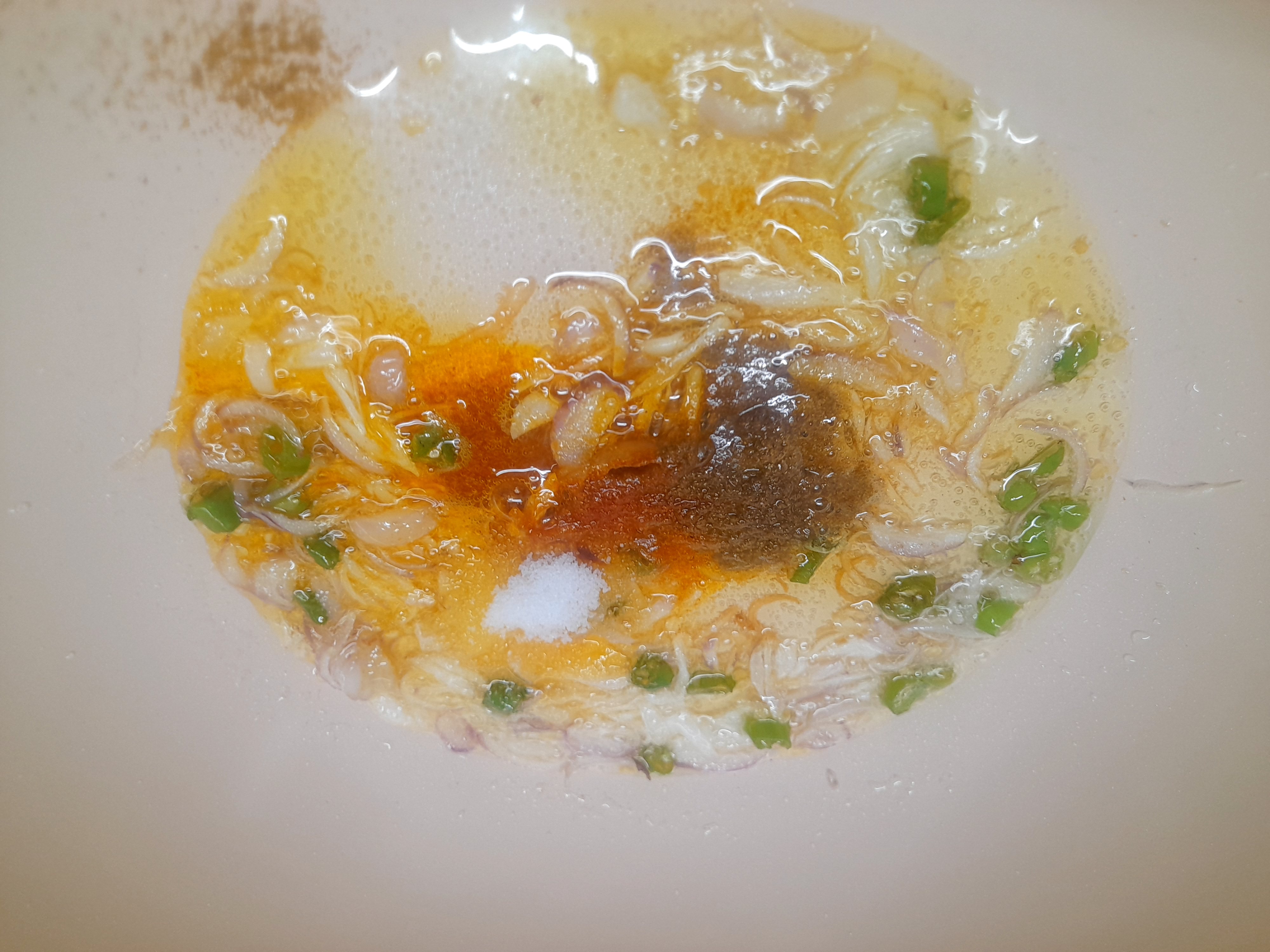 Then I add turmeric, chili powder, salt, to the semi fried onion, stirred well again. Let it fried for a while.