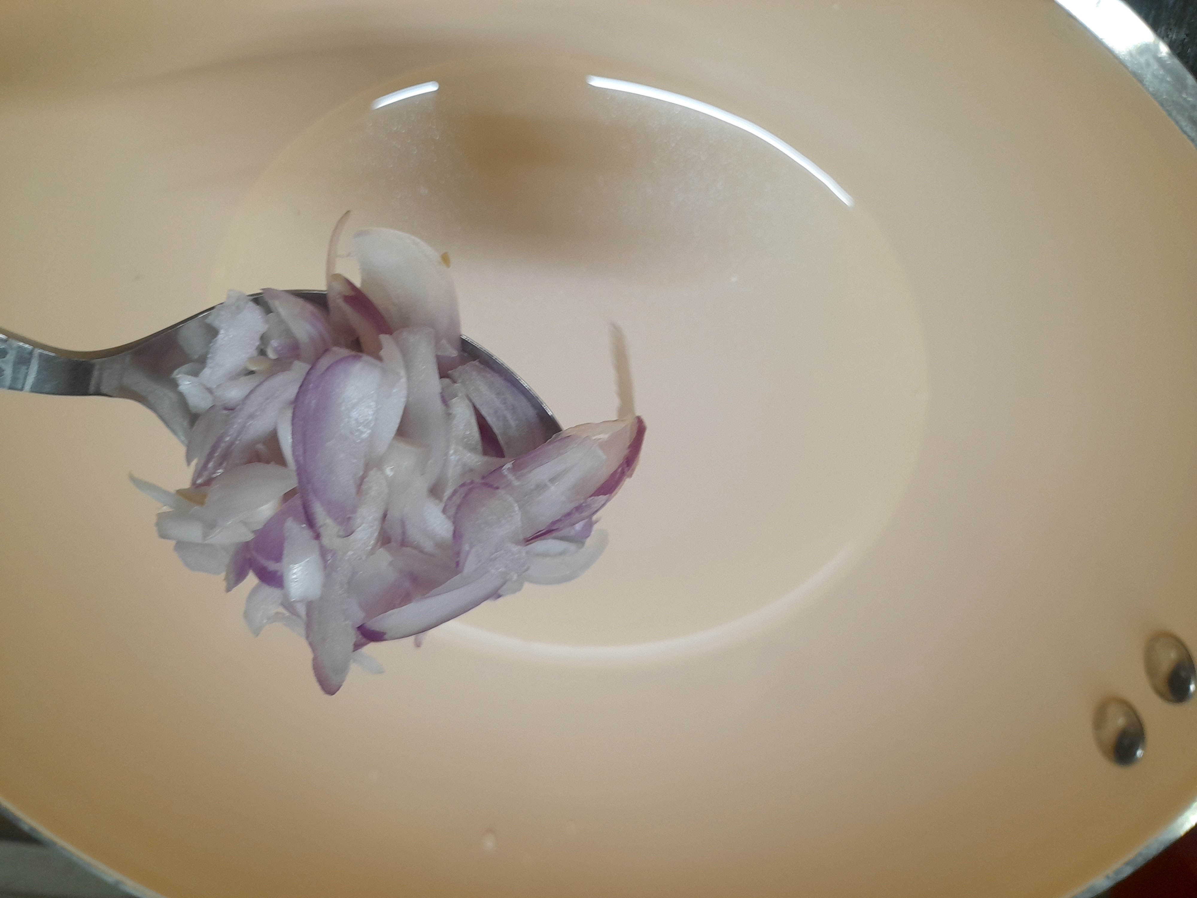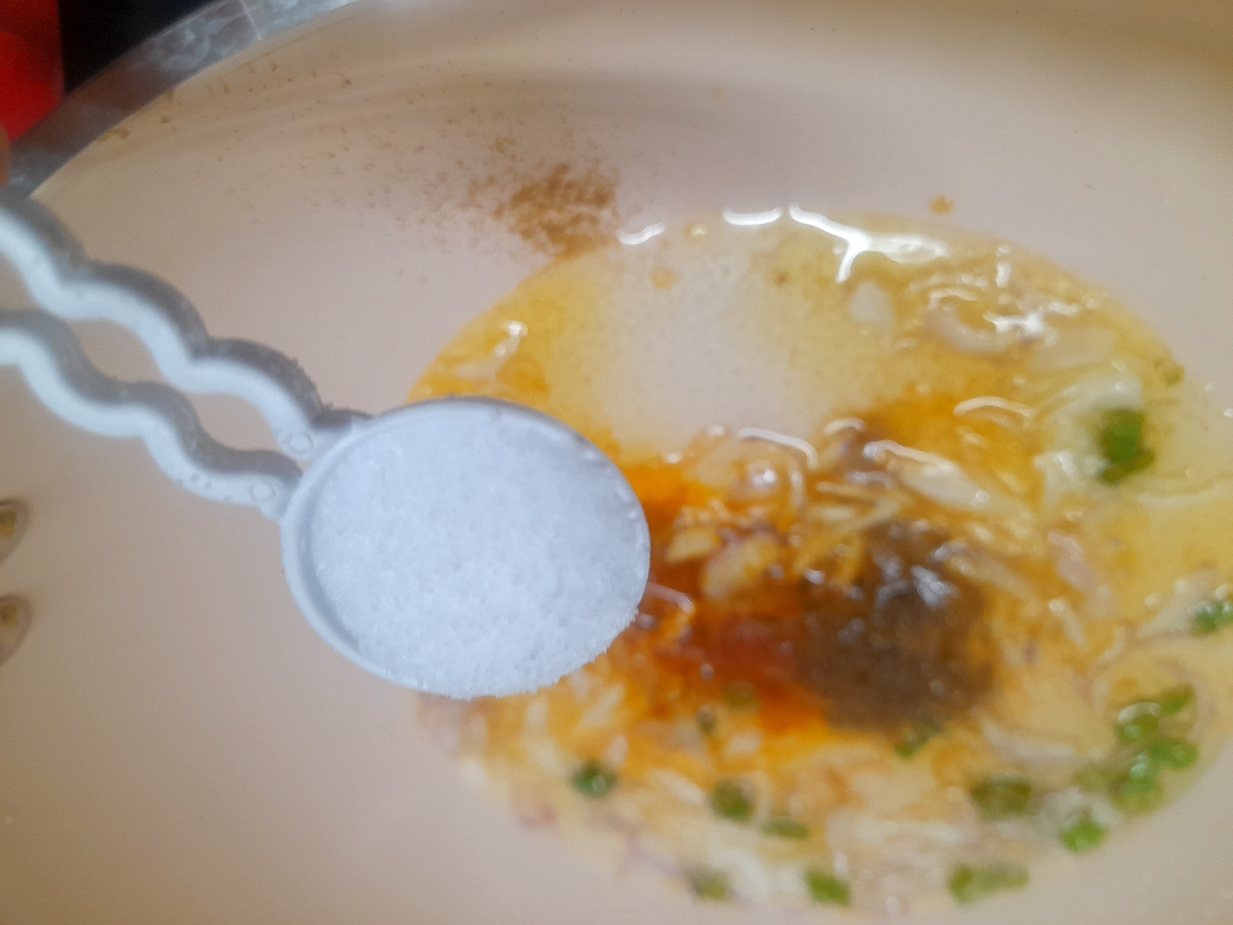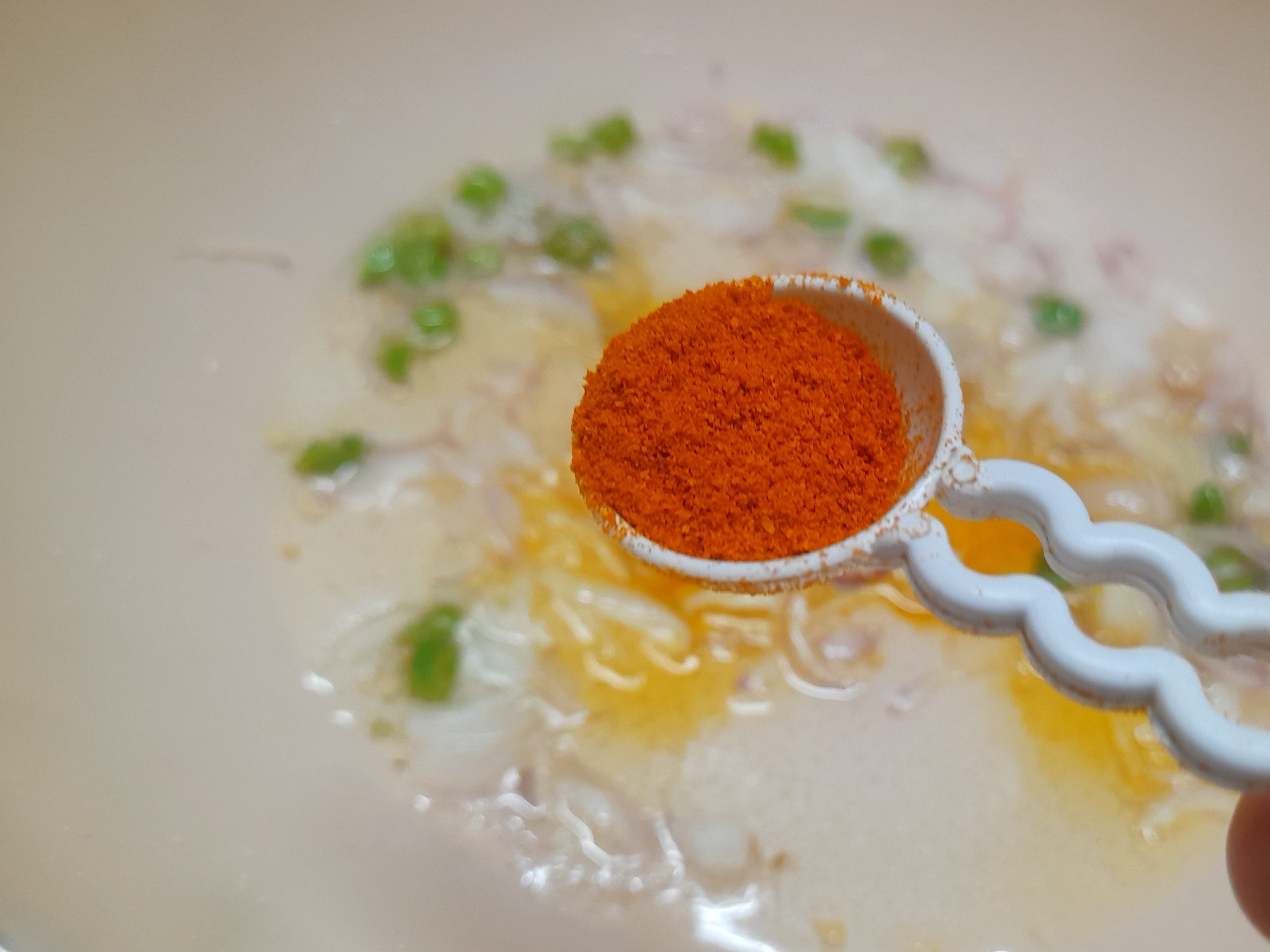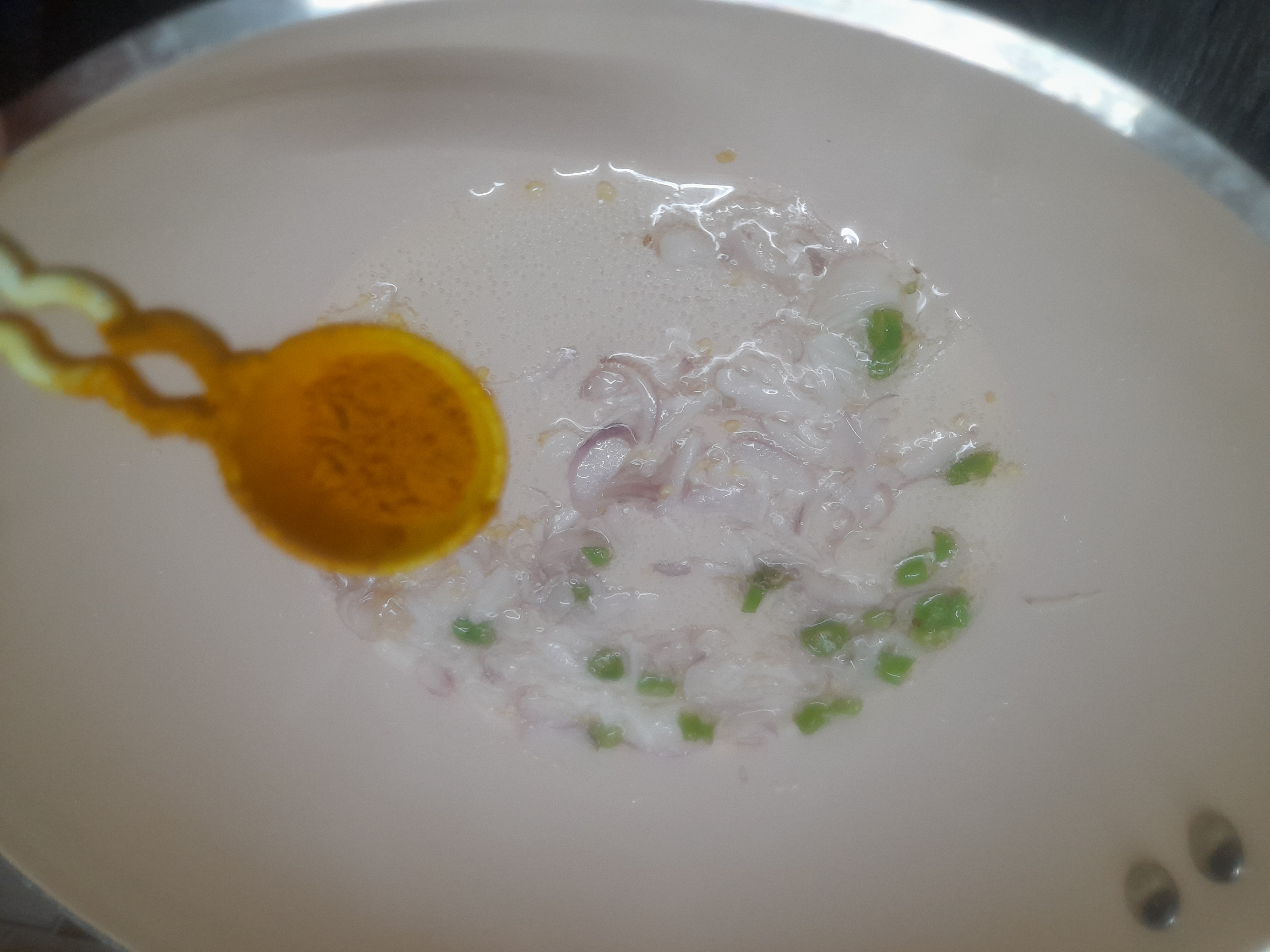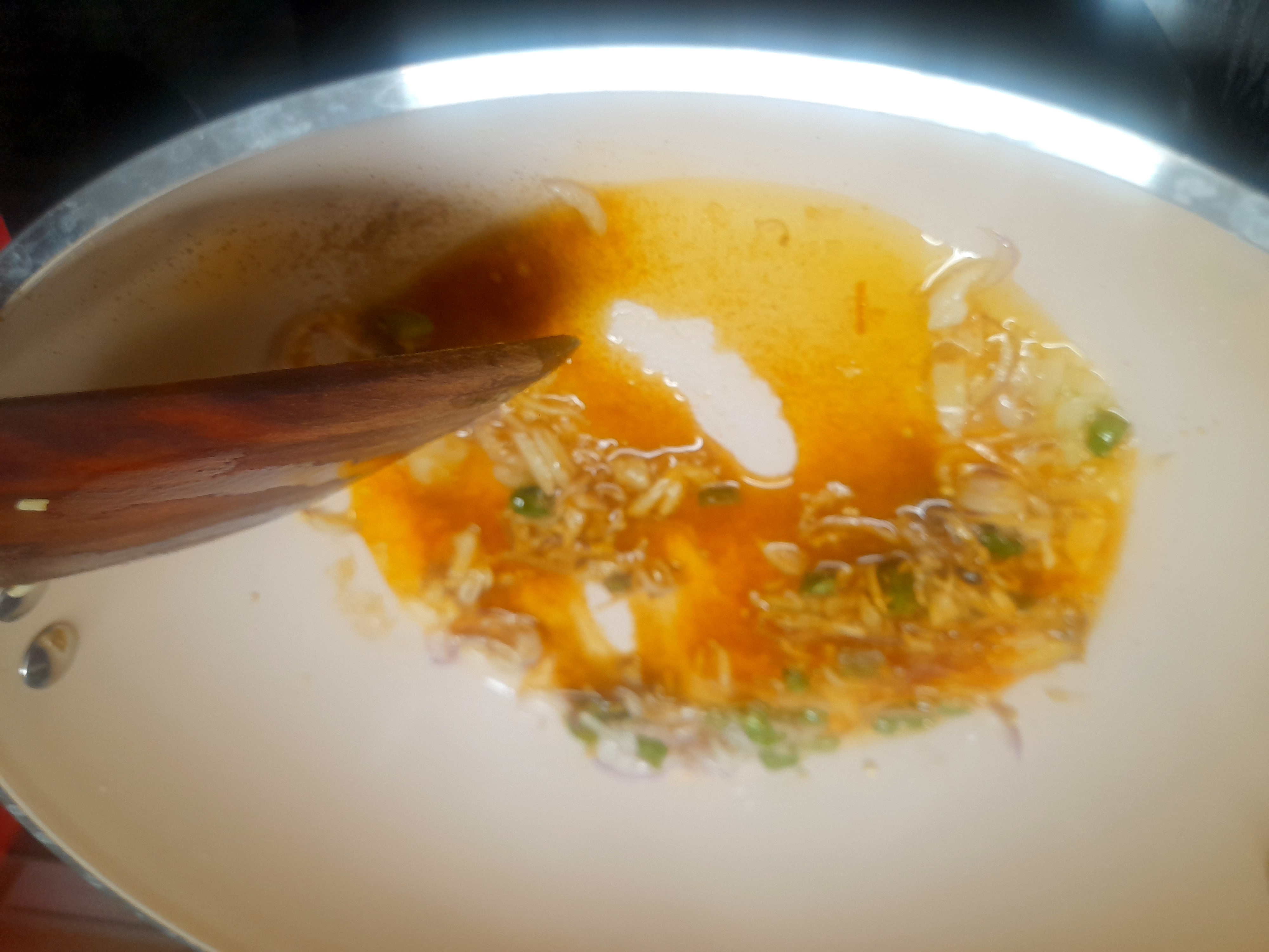 Then I add turmeric, chili powder, salt, to the semi fried onion, stirred well again. Let it fried for a while.