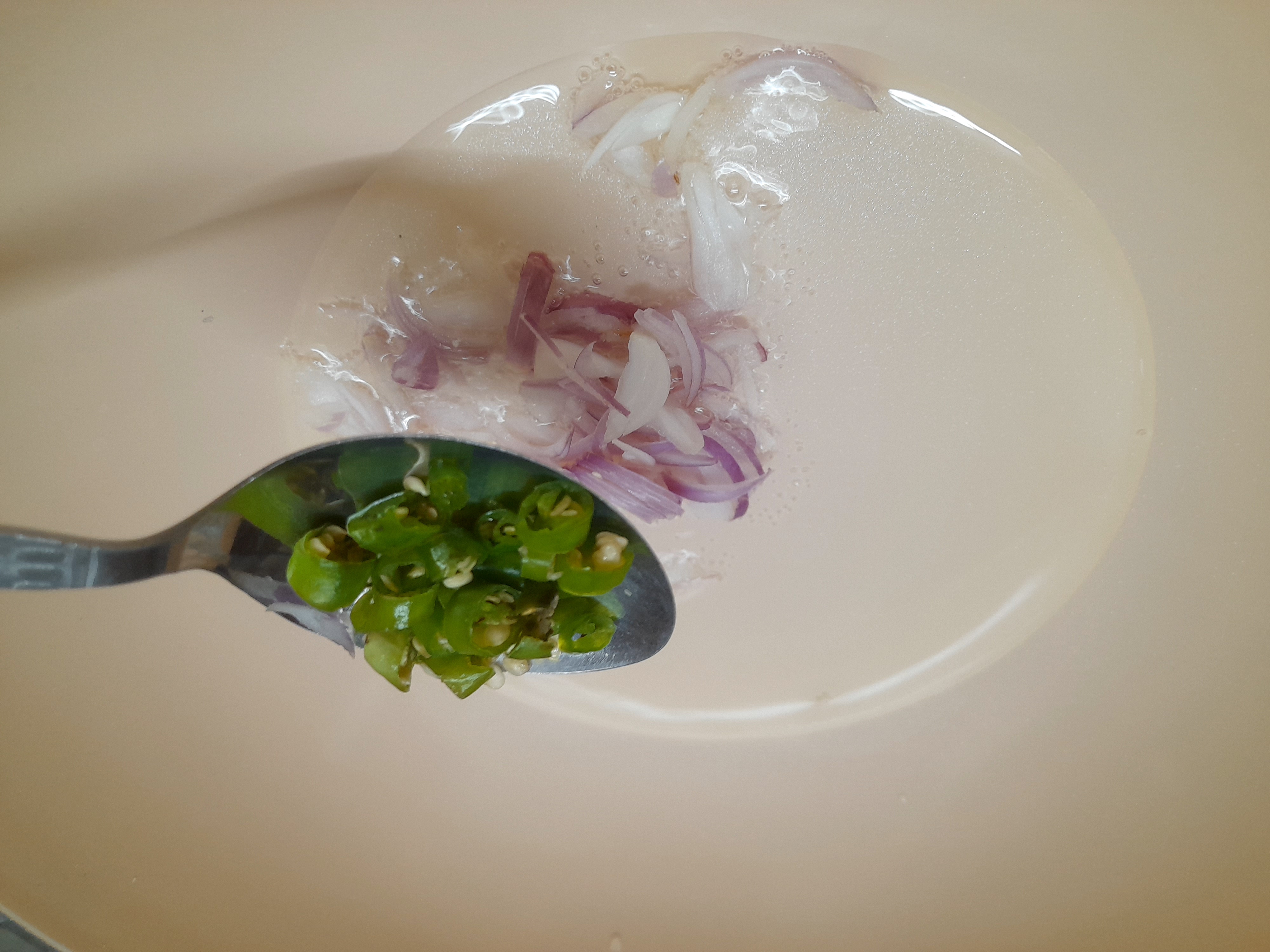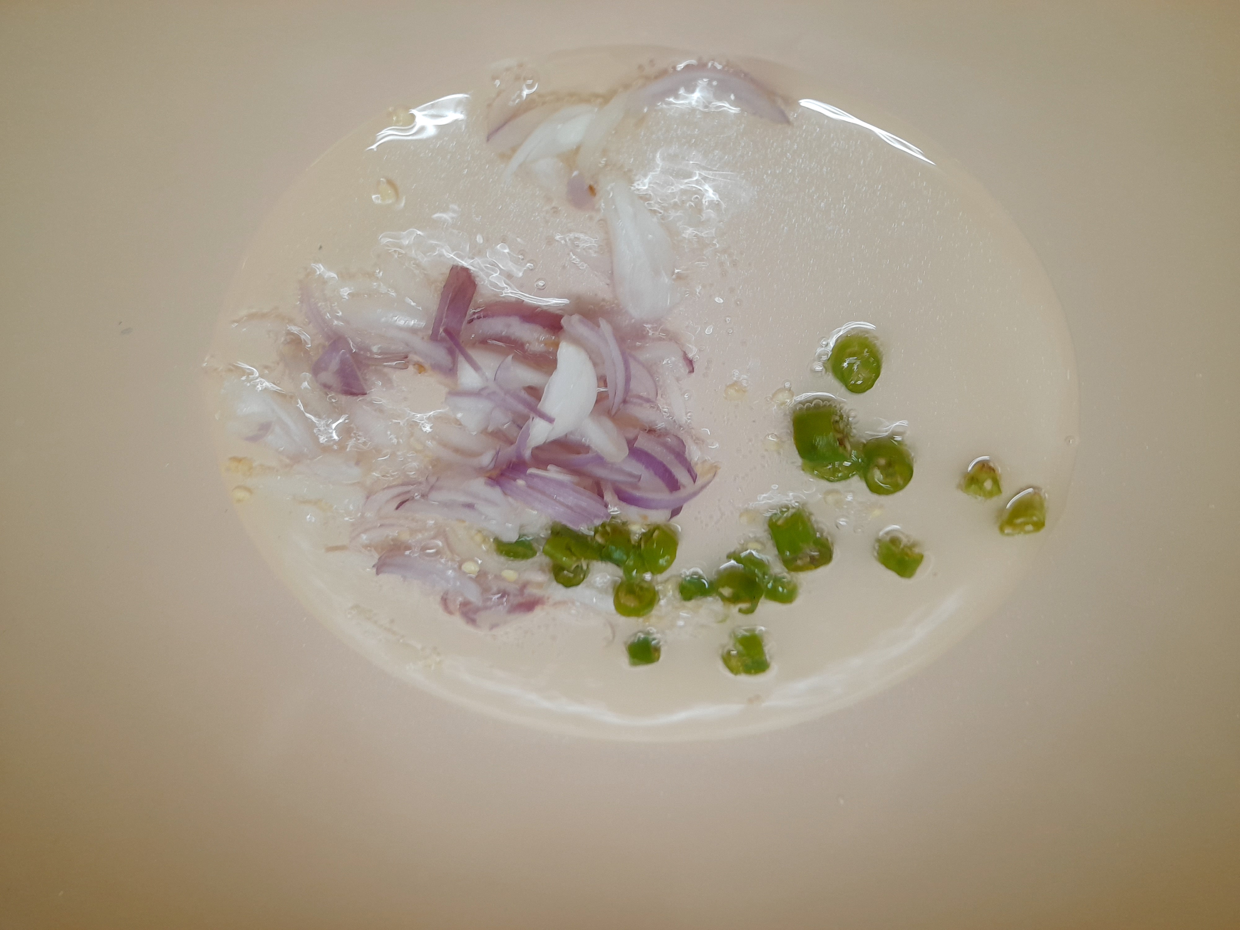 Then I added oil to the pan, let it heated for 1-2 minutrs and then drop chopped onion and green chilies, stirred well and fried them.