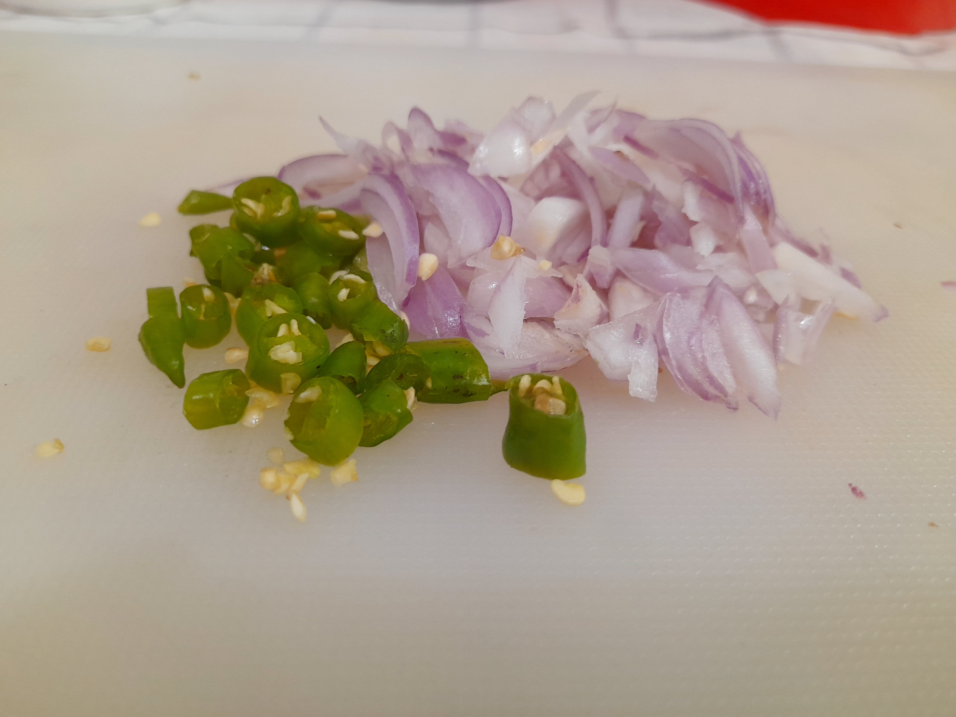 Then I cut 2 onions and 3 green chillies finely. It took me only 2-3 minutes. Don't forget to clean the ingredients with fresh water before cutting.
