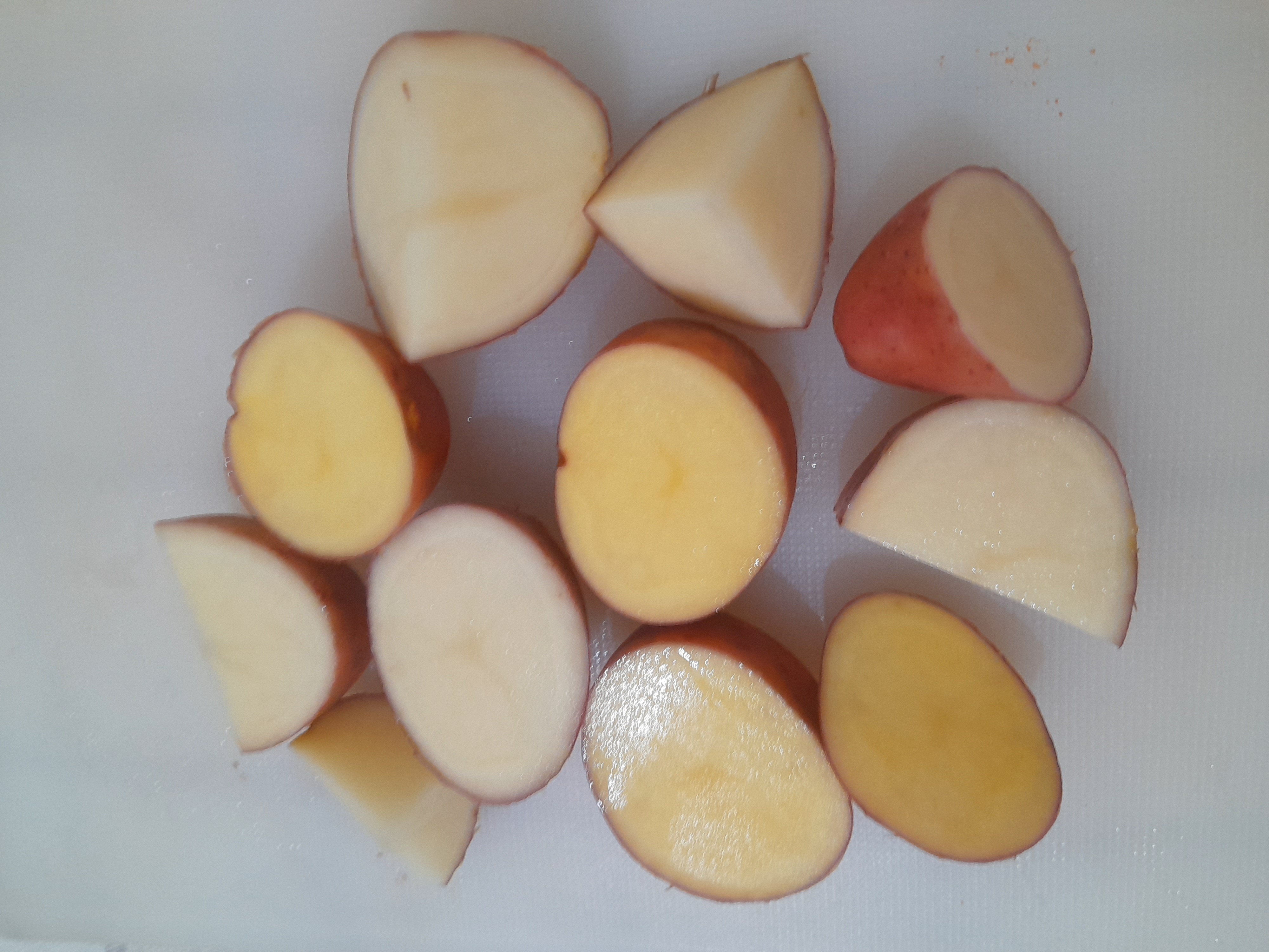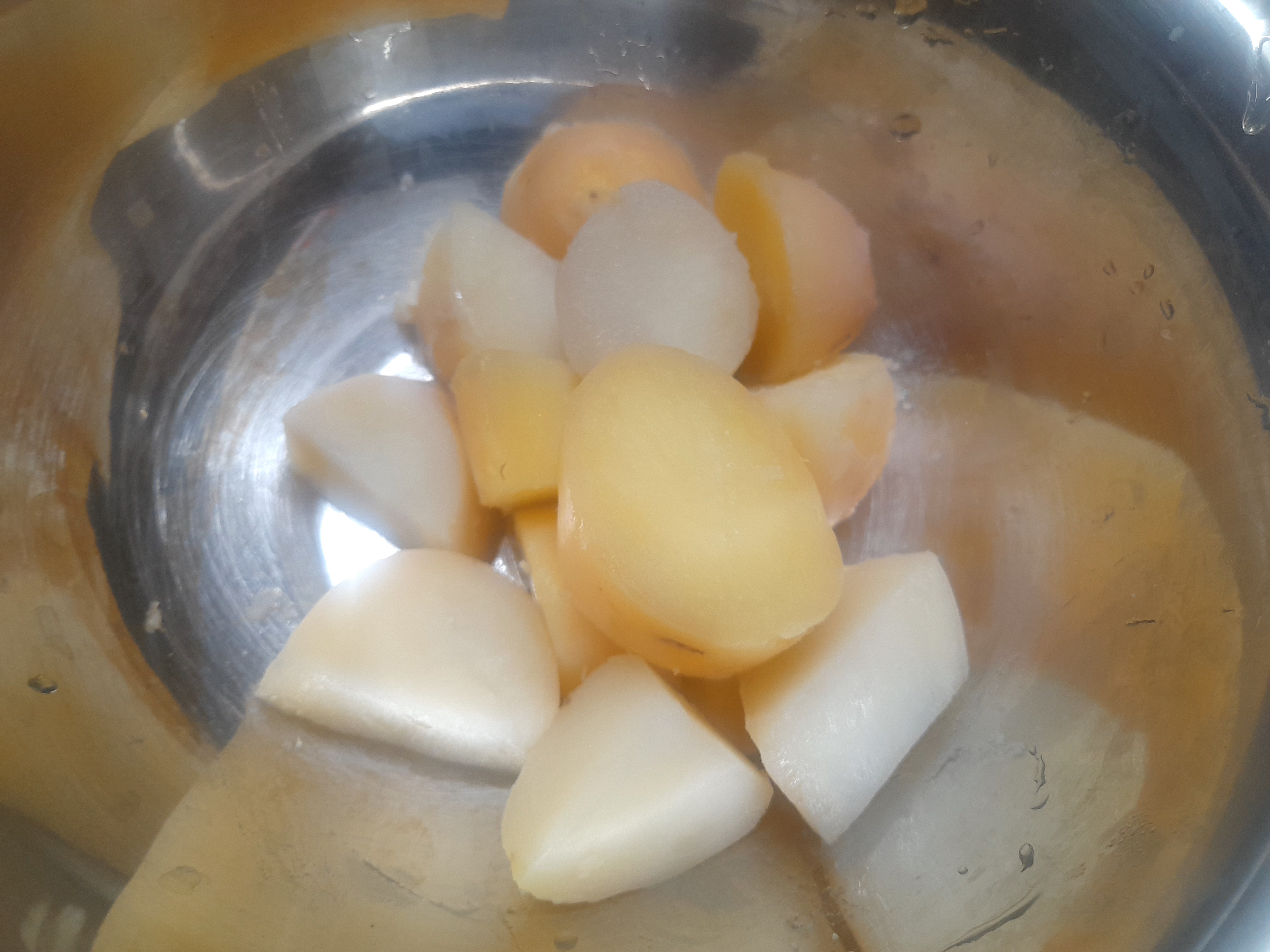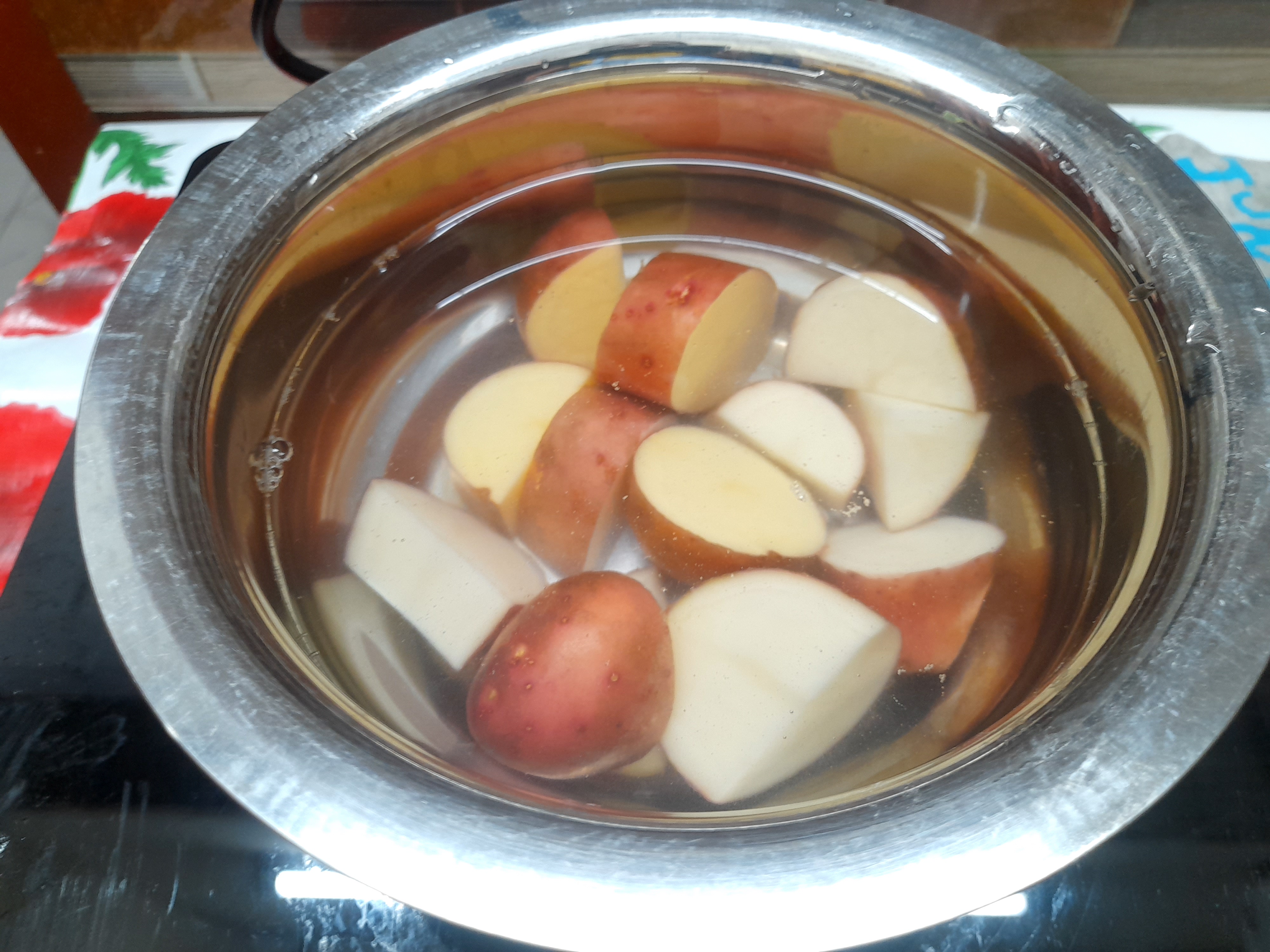 First I collect all the ingredients and then cut the potatoes after washing those. Then boil the potato pieces for about 15 minutes.