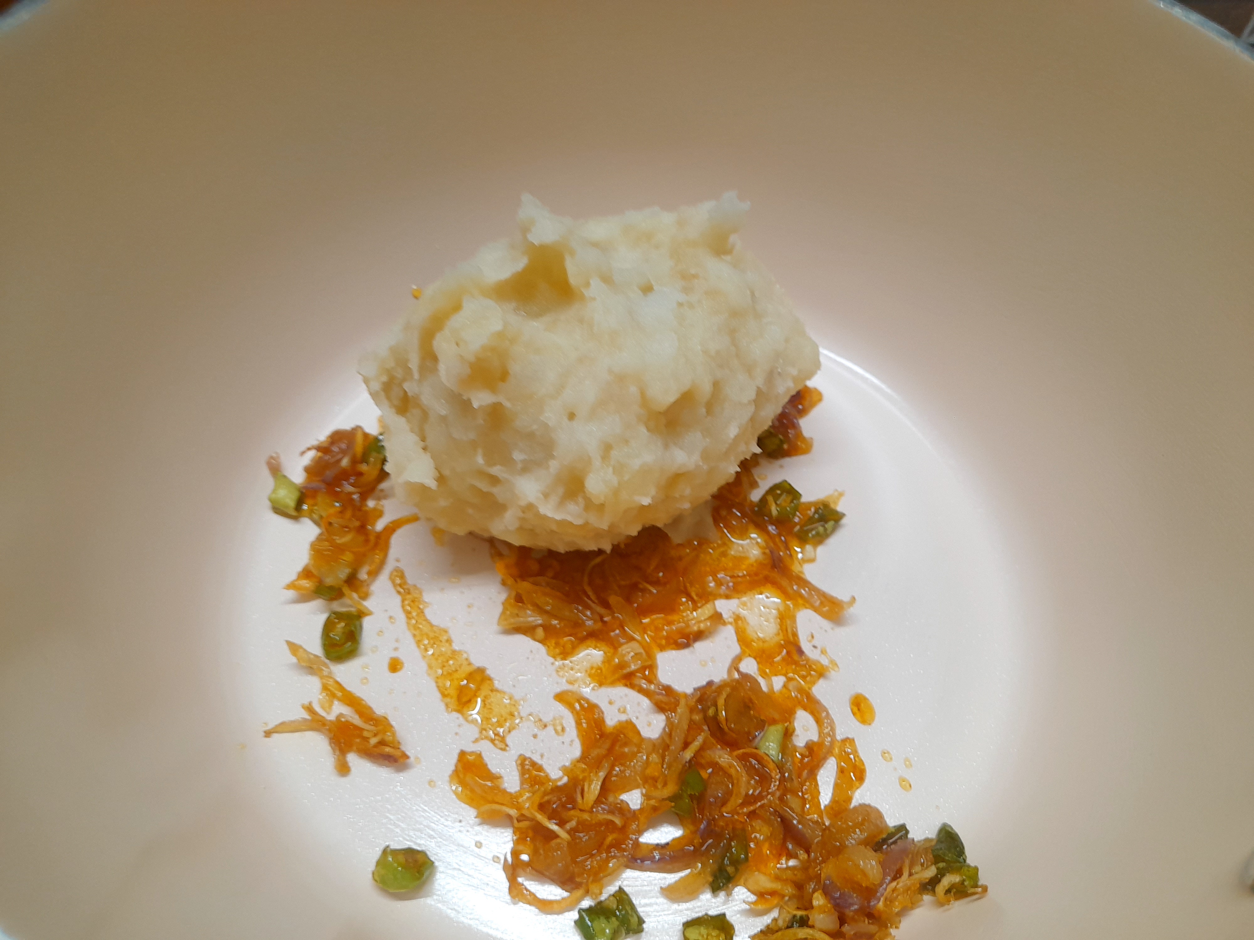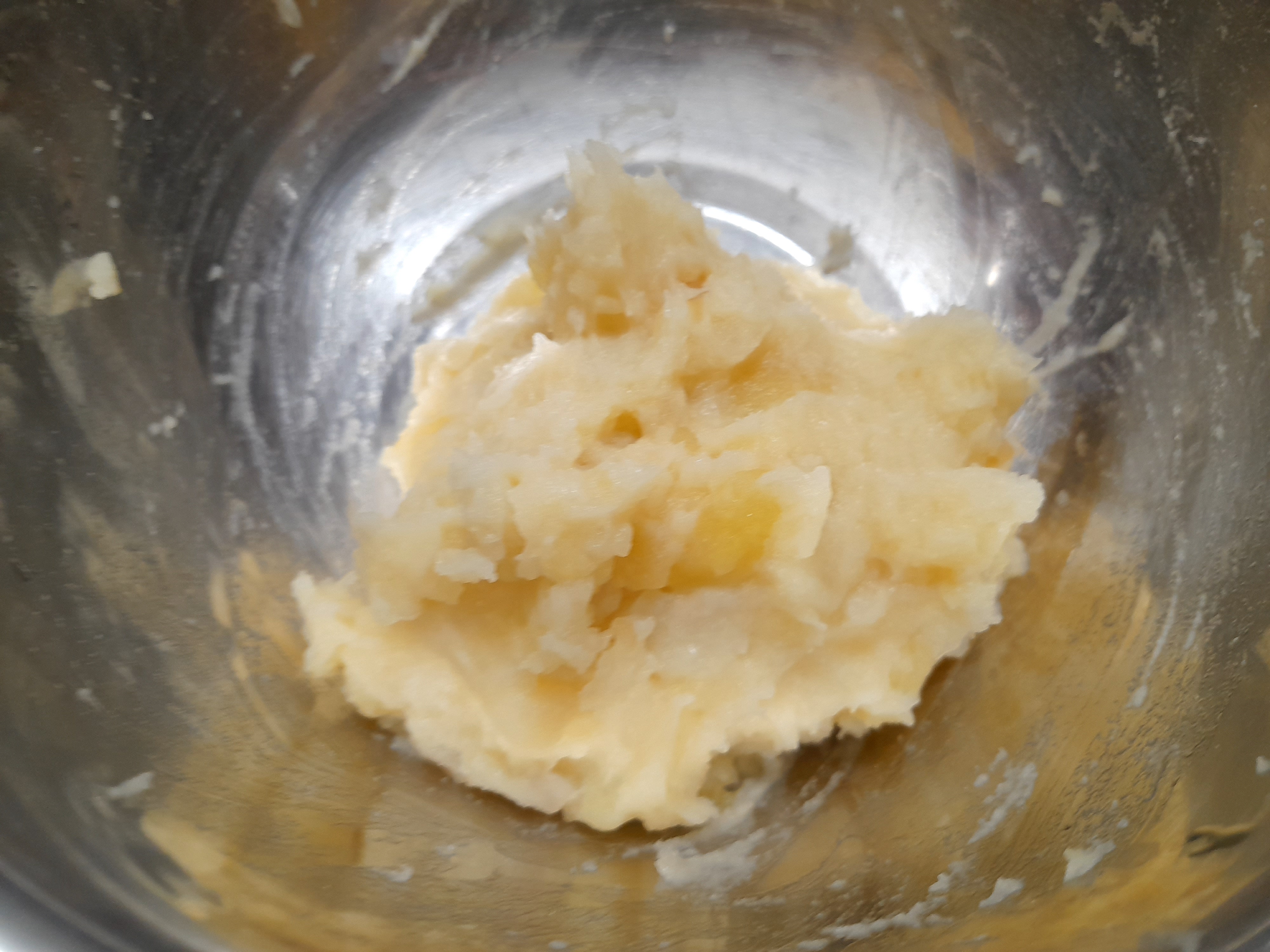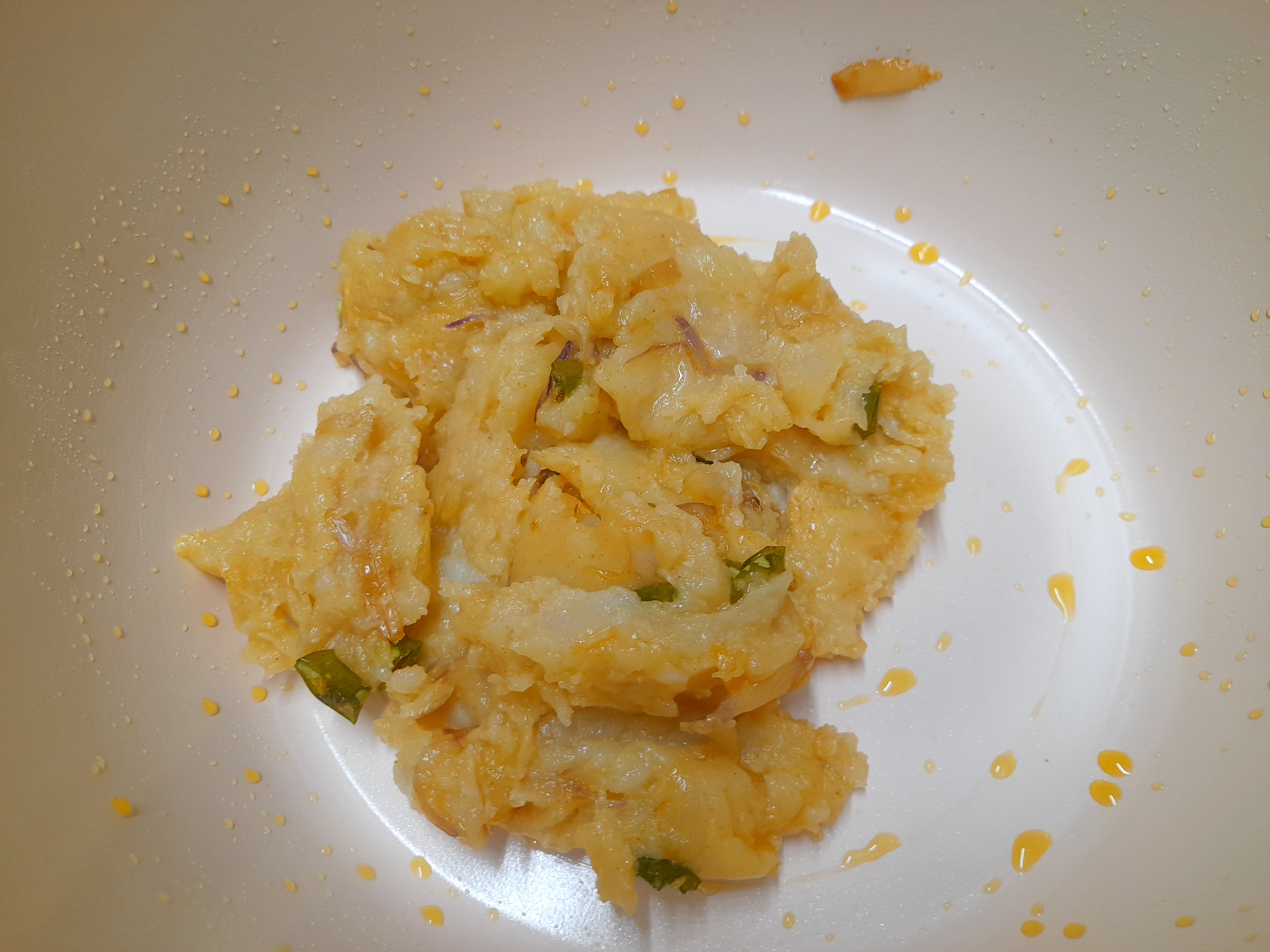 Then mash the boiled potatoes and and added them to the spices, stirring well again to mix everything together.