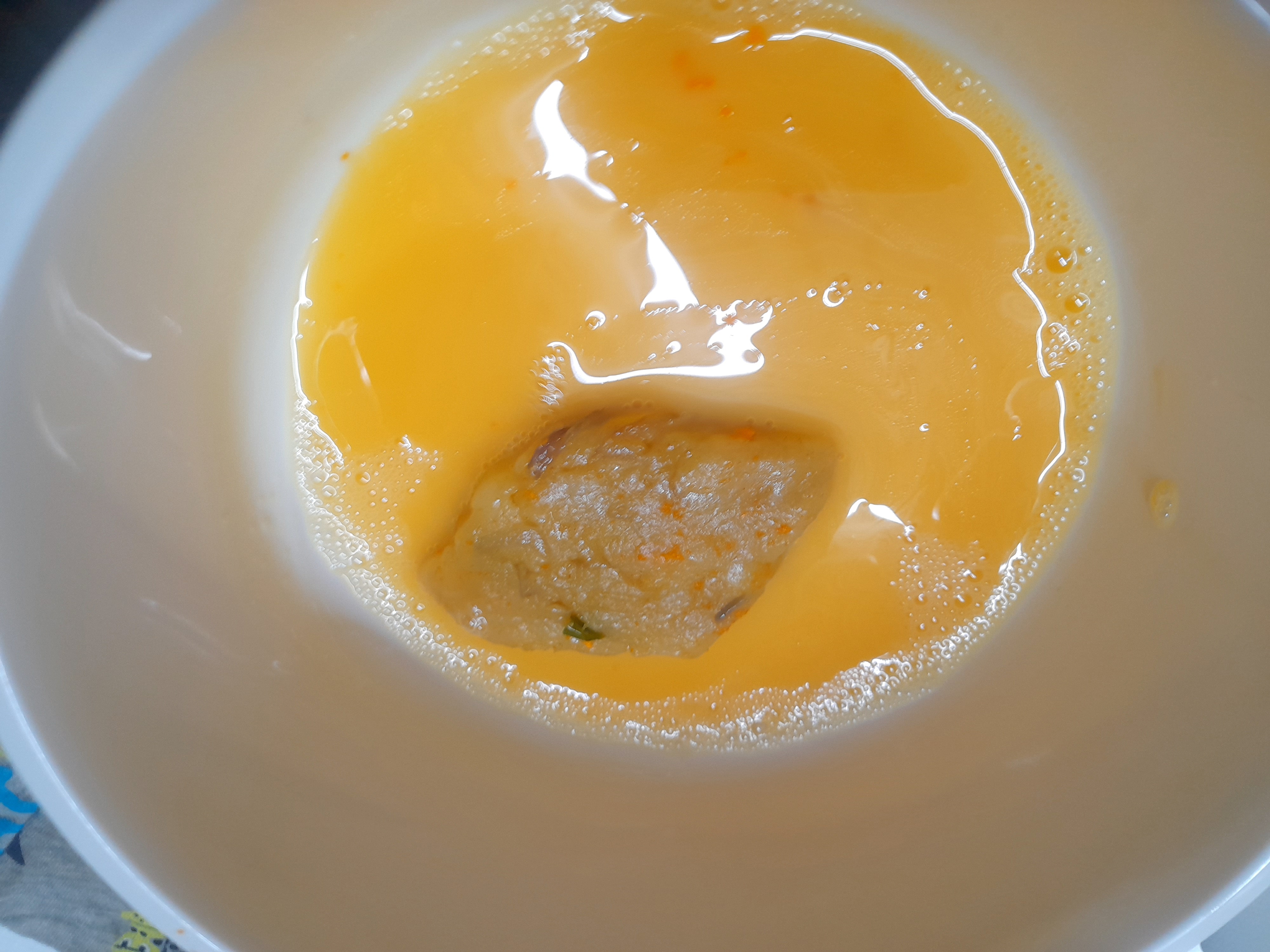In this step,I cracked an egg into a bowl. Then I dipped the potato cutlets in the egg and put them in the biscuit crumbs. Covered the potato cutlet evenly in the crumbs.