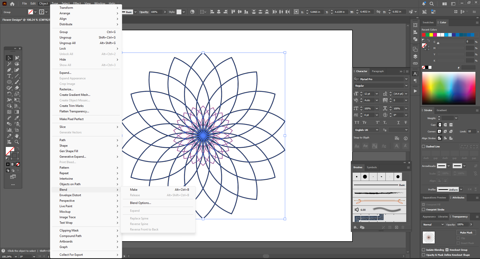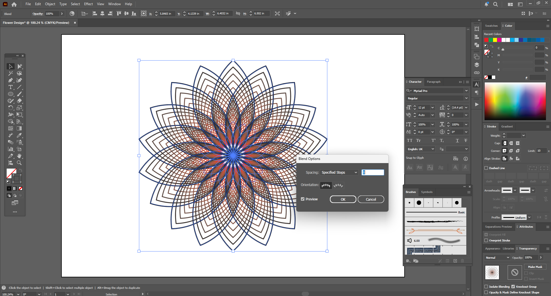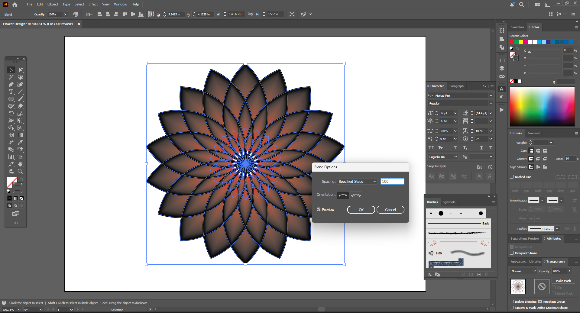 Then I went to the object and went to the blend option and clicked on the mac blend. Then my blend was created. I went back to the blend option and selected steps and started increasing the steps until I was happy with them. Then I increased them to 100 steps and now it looks good.