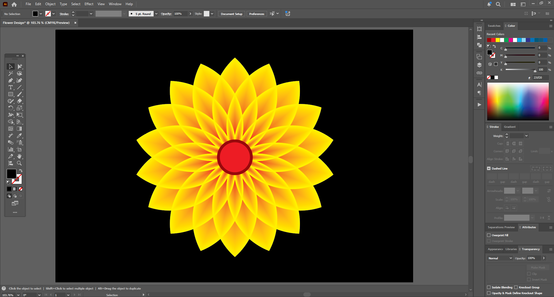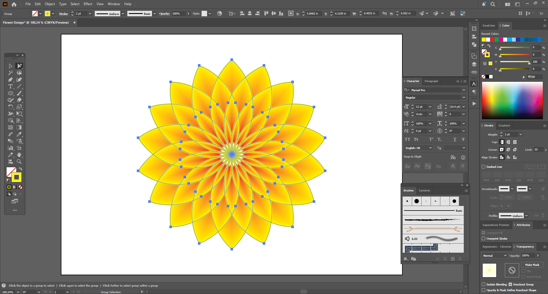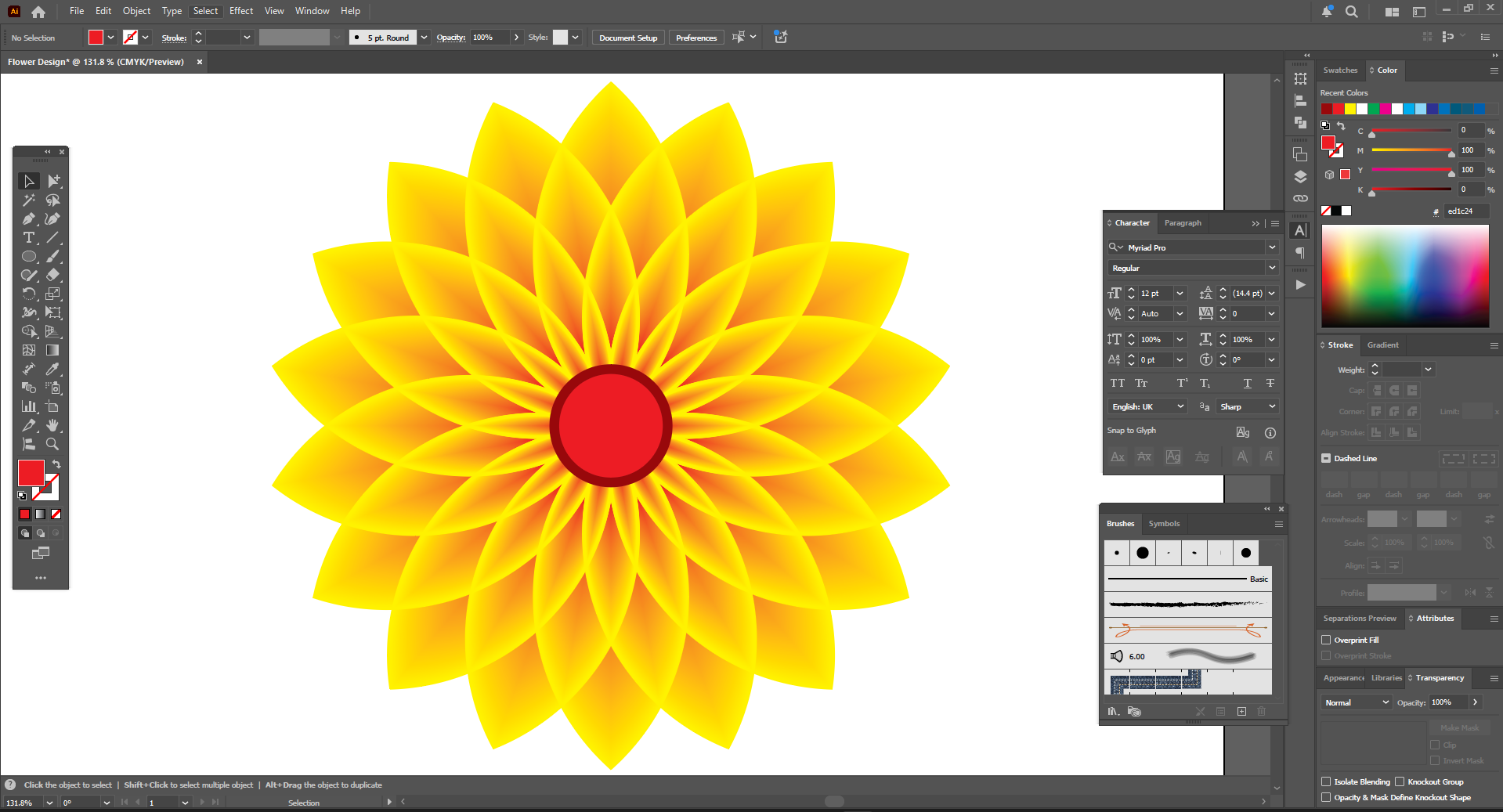Next, since I have kept my top stroke colors black, I need to change them. Then I changed the top strokes to yellow and the bottom copy to red. Now it looks like an attractive yellow flower. Then it's time to draw the calligraphic font in the middle.
