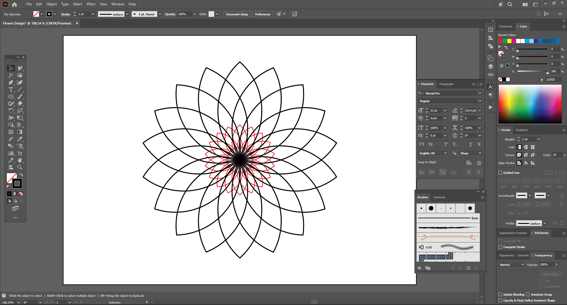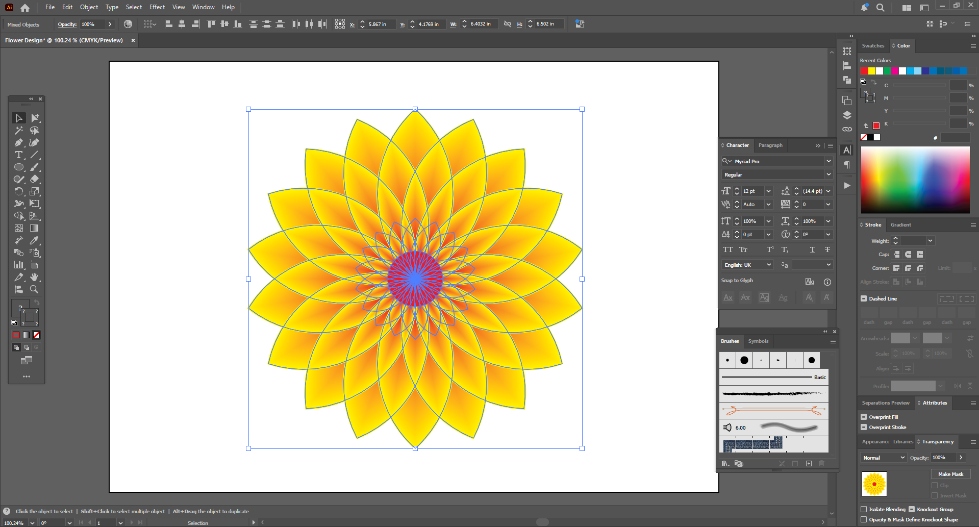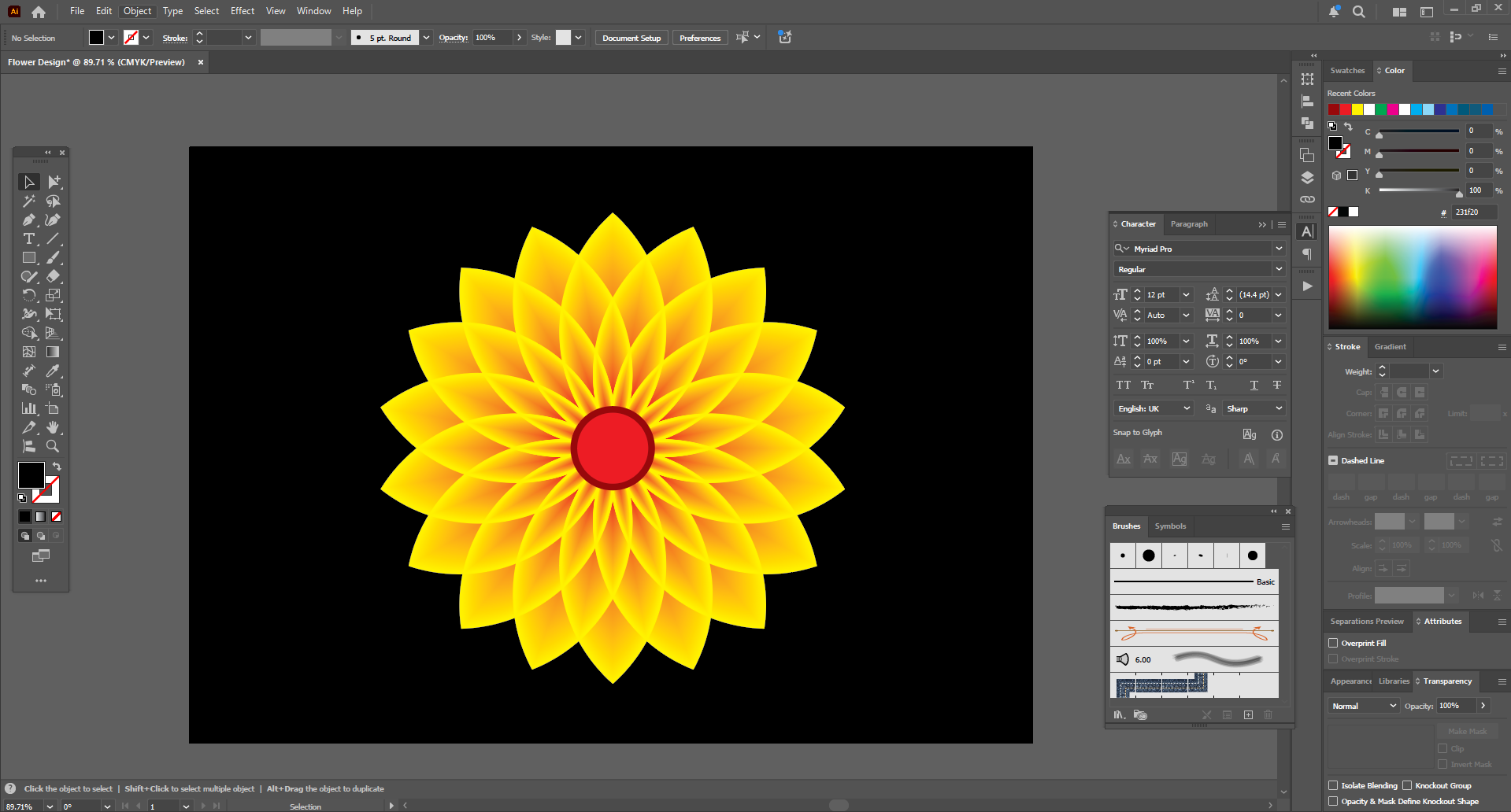 Next, since I have kept my top stroke colors black, I need to change them. Then I changed the top strokes to yellow and the bottom copy to red. Now it looks like an attractive yellow flower. Then it's time to draw the calligraphic font in the middle.
