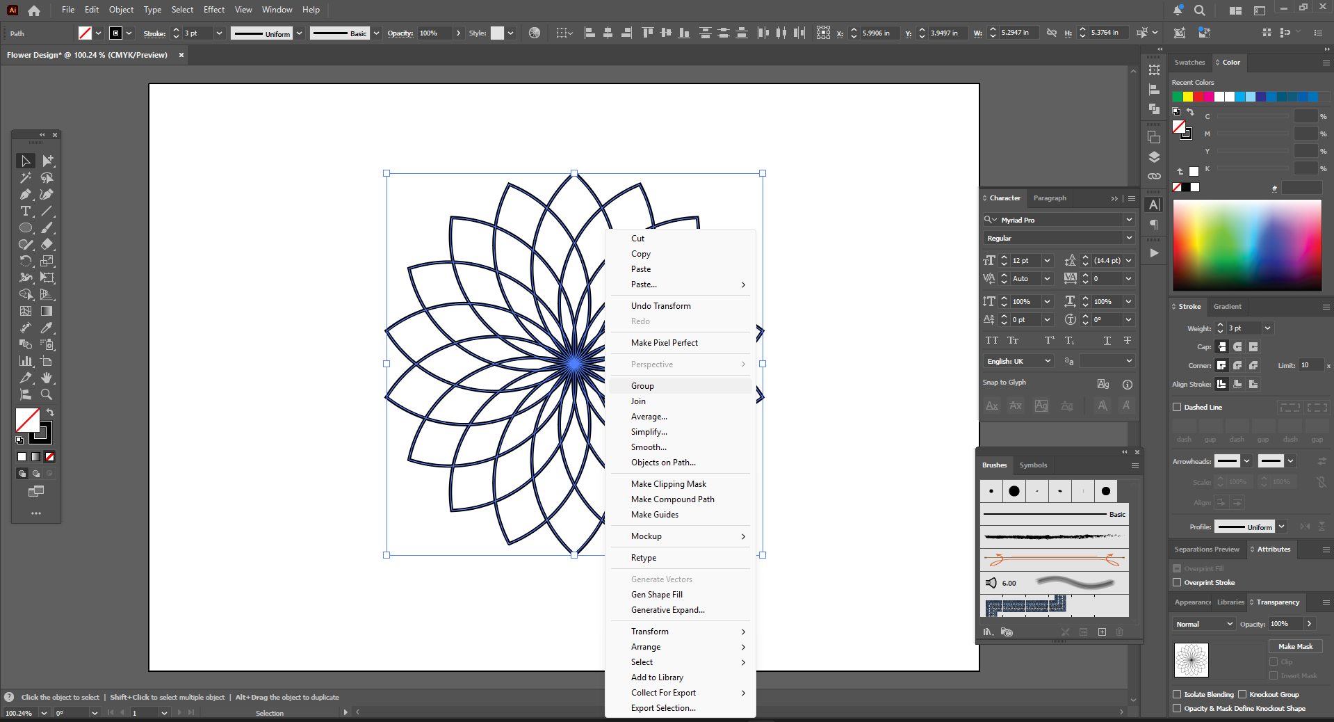 In this way I completed the entire circle and copied and pasted them in duplicate. Then I grouped all the leaves together by right clicking with the selection tool. After grouping, I copied the same flowers and pasted them in back, that is, I made another copy below the ones above.